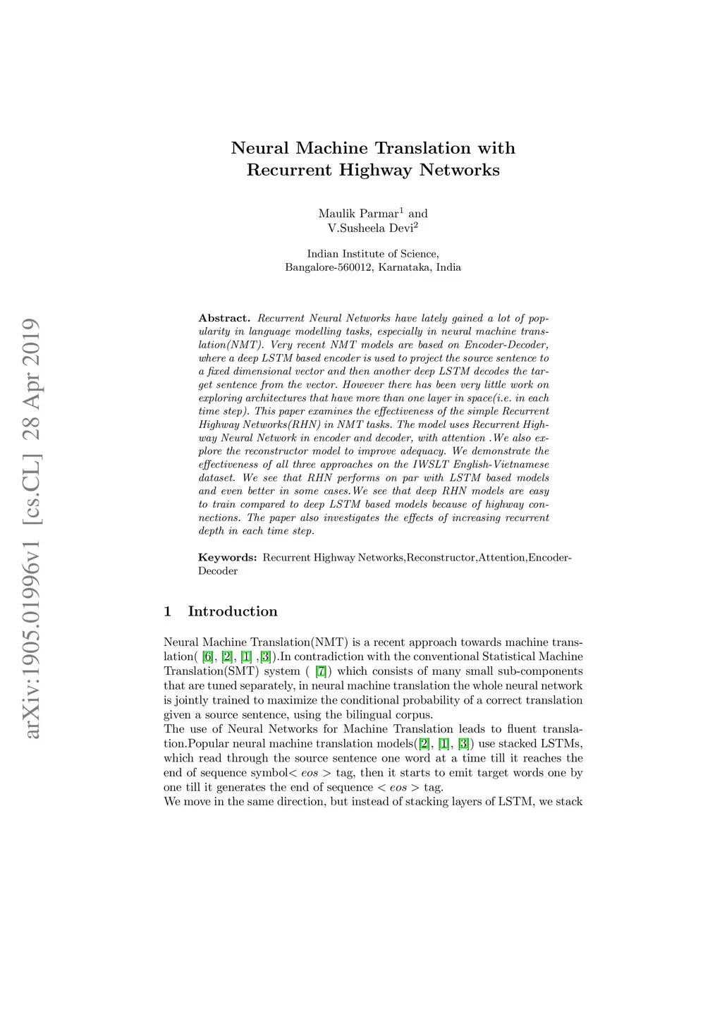 Recurrent Neural Networks have lately gained a lot of popularity in language modelling tasks, especially in neural machine translation(NMT). Very recent NMT models are based on Encoder-Decoder, where a deep LSTM based encoder is used to project the source sentence to a fixed dimensional vector and then another deep LSTM decodes the target sentence from the vector. However there has been very little work on exploring architectures that have more than one layer in space(i.e. in each time step). This paper examines the effectiveness of the simple Recurrent Highway Networks(RHN) in NMT tasks. The model uses Recurrent Highway Neural Network in encoder and decoder, with attention .We also explore the reconstructor model to improve adequacy. We demonstrate the effectiveness of all three approaches on the IWSLT English-Vietnamese dataset. We see that RHN performs on par with LSTM based models and even better in some cases.We see that deep RHN models are easy to train compared to deep LSTM based models because of highway connections. The paper also investigates the effects of increasing recurrent depth in each time step.