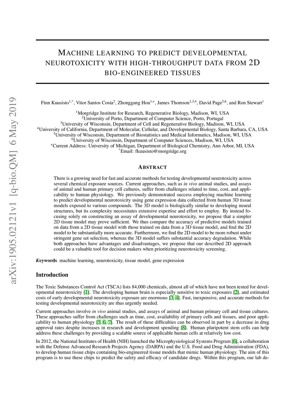 There is a growing need for fast and accurate methods for testing developmental neurotoxicity across several chemical exposure sources. Current approaches, such as in vivo animal studies, and assays of animal and human primary cell cultures, suffer from challenges related to time, cost, and applicability to human physiology. We previously demonstrated success employing machine learning to predict developmental neurotoxicity using gene expression data collected from human 3D tissue models exposed to various compounds. The 3D model is biologically similar to developing neural structures, but its complexity necessitates extensive expertise and effort to employ. By instead focusing solely on constructing an assay of developmental neurotoxicity, we propose that a simpler 2D tissue model may prove sufficient. We thus compare the accuracy of predictive models trained on data from a 2D tissue model with those trained on data from a 3D tissue model, and find the 2D model to be substantially more accurate. Furthermore, we find the 2D model to be more robust under stringent gene set selection, whereas the 3D model suffers substantial accuracy degradation. While both approaches have advantages and disadvantages, we propose that our described 2D approach could be a valuable tool for decision makers when prioritizing neurotoxicity screening.