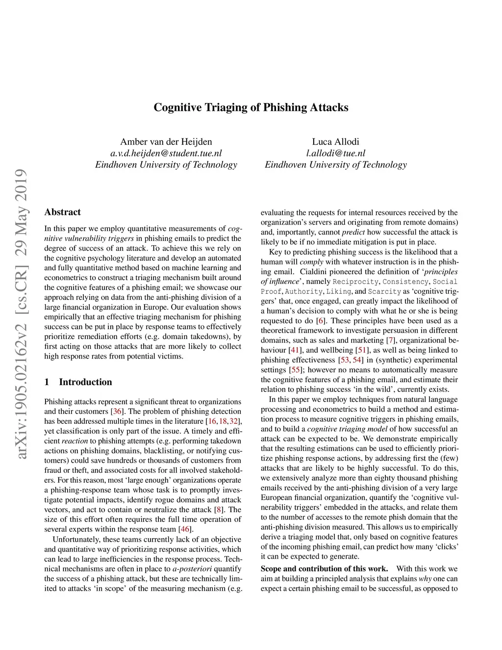 In this paper we employ quantitative measurements of cognitive vulnerability triggers in phishing emails to predict the degree of success of an attack. To achieve this we rely on the cognitive psychology literature and develop an automated and fully quantitative method based on machine learning and econometrics to construct a triaging mechanism built around the cognitive features of a phishing email; we showcase our approach relying on data from the anti-phishing division of a large financial organization in Europe. Our evaluation shows empirically that an effective triaging mechanism for phishing success can be put in place by response teams to effectively prioritize remediation efforts (e.g. domain takedowns), by first acting on those attacks that are more likely to collect high response rates from potential victims.