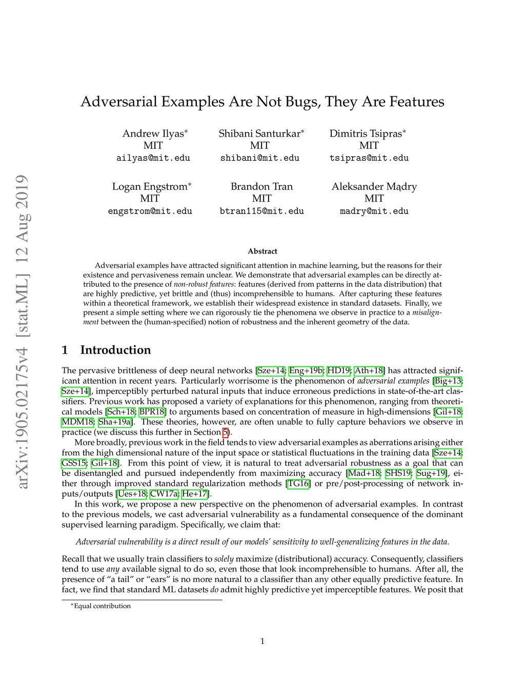 Adversarial examples have attracted significant attention in machine learning, but the reasons for their existence and pervasiveness remain unclear. We demonstrate that adversarial examples can be directly attributed to the presence of non-robust features: features derived from patterns in the data distribution that are highly predictive, yet brittle and incomprehensible to humans. After capturing these features within a theoretical framework, we establish their widespread existence in standard datasets. Finally, we present a simple setting where we can rigorously tie the phenomena we observe in practice to a misalignment between the (human-specified) notion of robustness and the inherent geometry of the data.