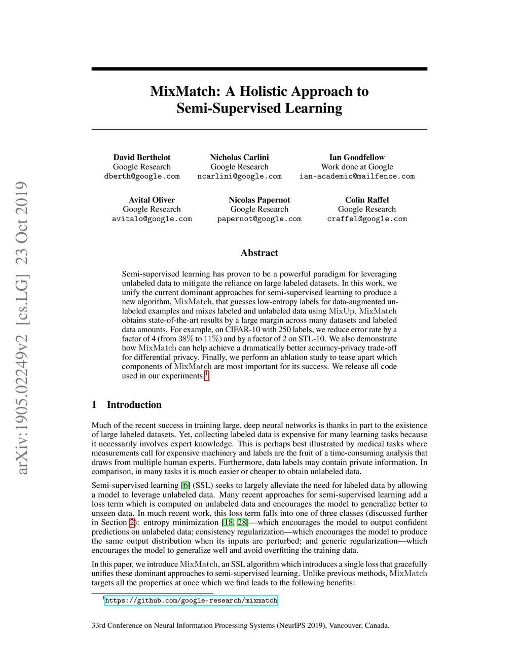 Semi-supervised learning has proven to be a powerful paradigm for leveraging unlabeled data to mitigate the reliance on large labeled datasets. In this work, we unify the current dominant approaches for semi-supervised learning to produce a new algorithm, MixMatch, that works by guessing low-entropy labels for data-augmented unlabeled examples and mixing labeled and unlabeled data using MixUp. We show that MixMatch obtains state-of-the-art results by a large margin across many datasets and labeled data amounts. For example, on CIFAR-10 with 250 labels, we reduce error rate by a factor of 4 (from 38% to 11%) and by a factor of 2 on STL-10. We also demonstrate how MixMatch can help achieve a dramatically better accuracy-privacy trade-off for differential privacy. Finally, we perform an ablation study to tease apart which components of MixMatch are most important for its success.
