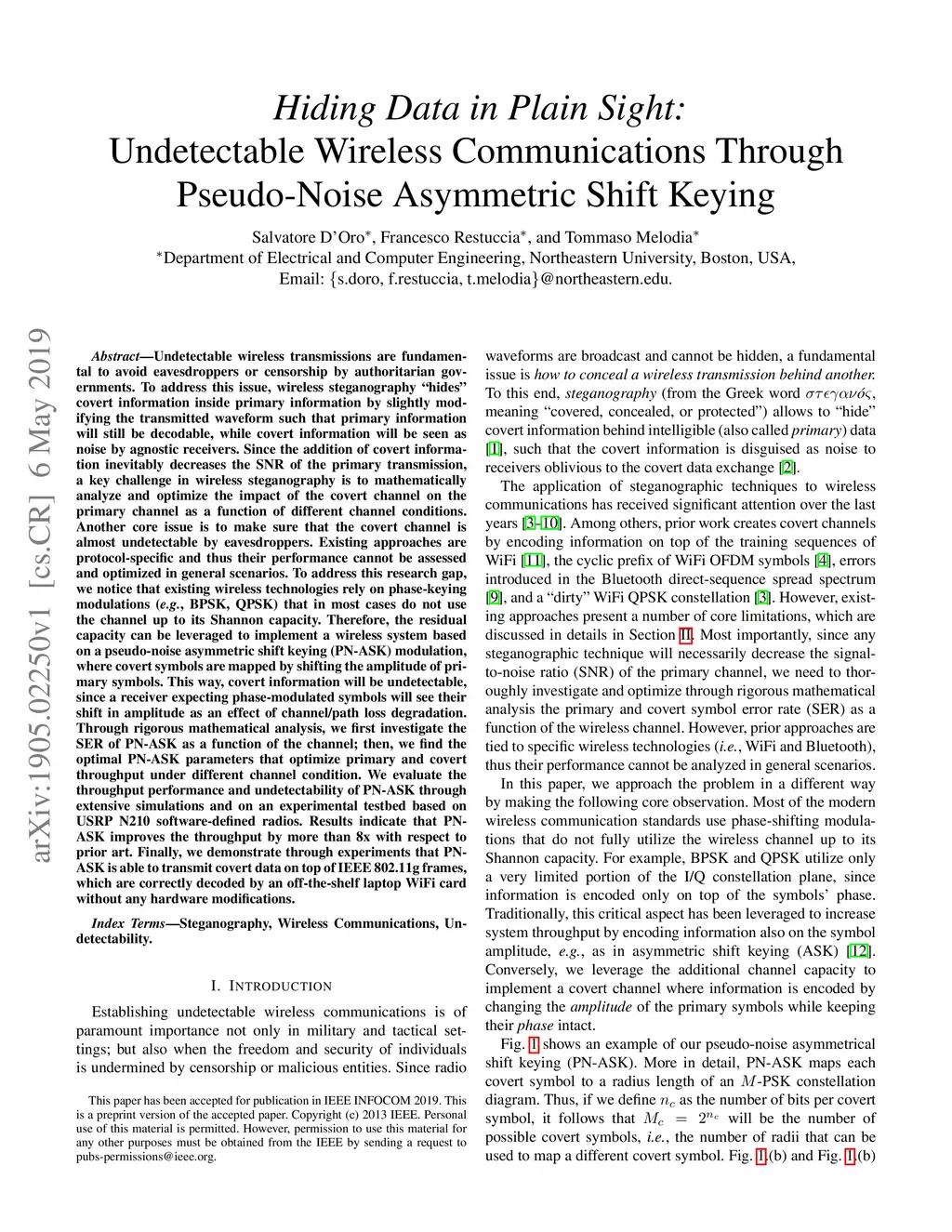 Undetectable wireless transmissions are fundamental to avoid eavesdroppers. To address this issue, wireless steganography hides covert information inside primary information by slightly modifying the transmitted waveform such that primary information will still be decodable, while covert information will be seen as noise by agnostic receivers. Since the addition of covert information inevitably decreases the SNR of the primary transmission, key challenges in wireless steganography are: i) to assess the impact of the covert channel on the primary channel as a function of different channel conditions; and ii) to make sure that the covert channel is undetectable. Existing approaches are protocol-specific, also we notice that existing wireless technologies rely on phase-keying modulations that in most cases do not use the channel up to its Shannon capacity. Therefore, the residual capacity can be leveraged to implement a wireless system based on a pseudo-noise asymmetric shift keying (PN-ASK) modulation, where covert symbols are mapped by shifting the amplitude of primary symbols. This way, covert information will be undetectable, since a receiver expecting phase-modulated symbols will see their shift in amplitude as an effect of channel/path loss degradation. We first investigate the SER of PN-ASK as a function of the channel; then, we find the optimal PN-ASK parameters that optimize primary and covert throughput under different channel condition. We evaluate the throughput performance and undetectability of PN-ASK through extensive simulations and on an experimental testbed based on USRP N210 software-defined radios. We show that PN-ASK improves the throughput by more than 8x with respect to prior art. Finally, we demonstrate through experiments that PN-ASK is able to transmit covert data on top of IEEE 802.11g frames, which are correctly decoded by an off-the-shelf laptop WiFi.