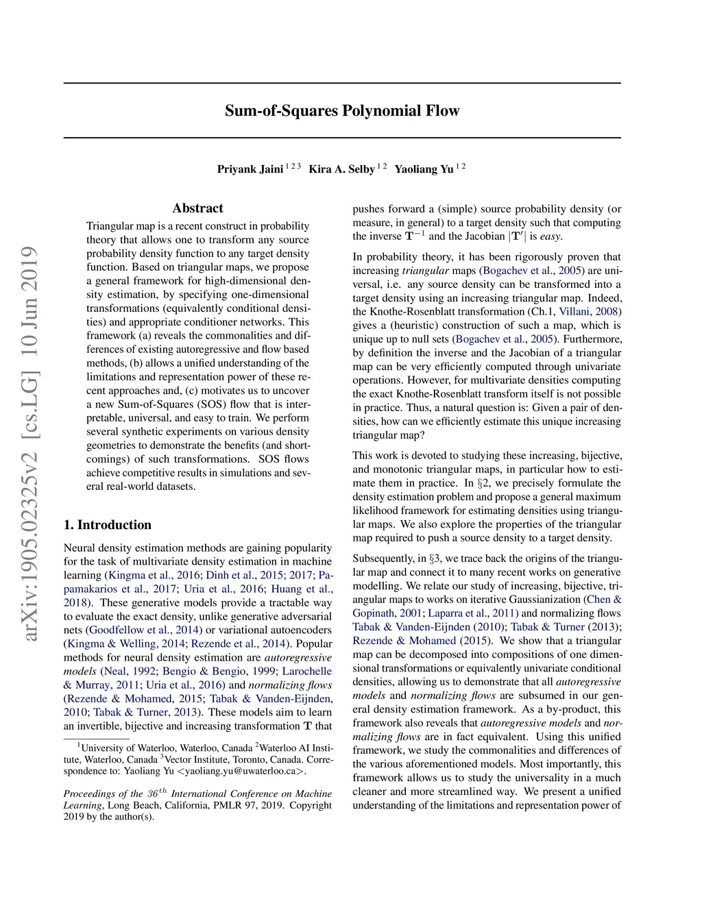 Triangular map is a recent construct in probability theory that allows one to transform any source probability density function to any target density function. Based on triangular maps, we propose a general framework for high-dimensional density estimation, by specifying one-dimensional transformations (equivalently conditional densities) and appropriate conditioner networks. This framework (a) reveals the commonalities and differences of existing autoregressive and flow based methods, (b) allows a unified understanding of the limitations and representation power of these recent approaches and, (c) motivates us to uncover a new Sum-of-Squares (SOS) flow that is interpretable, universal, and easy to train. We perform several synthetic experiments on various density geometries to demonstrate the benefits (and short-comings) of such transformations. SOS flows achieve competitive results in simulations and several real-world datasets.