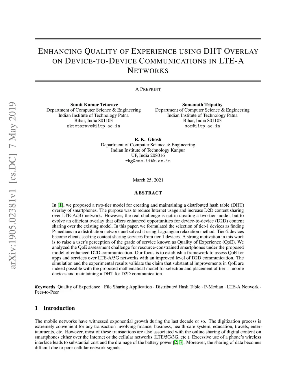 In [1], we proposed a two-tier model for creating and maintaining a distributed hash table (DHT) overlay of smartphones. The purpose was to reduce Internet usage and increase D2D content sharing over LTE-A/5G network. However, the real challenge is not in creating a two-tier model, but to evolve an efficient overlay that offers enhanced opportunities for device-to-device (D2D) content sharing over the existing model. In this paper, we formulated the selection of tier-1 devices as finding P-medians in a distribution network and solved it using Lagrangian relaxation method. Tier-2 devices become clients seeking content sharing services from tier-1 devices. A strong motivation in this work is to raise a user's perception of the grade of service known as Quality of Experience (QoE). We analyzed the QoE assessment challenge for resource-constrained smartphones under the proposed model of enhanced D2D communication. Our focus is to establish a framework to assess QoE for apps and services over LTE-A/5G networks with an improved level of D2D communication. The simulation and the experimental results validate the claim that substantial improvements in QoE are indeed possible with the proposed mathematical model for selection and placement of tier-1 mobile devices and maintaining a DHT for D2D communication.
