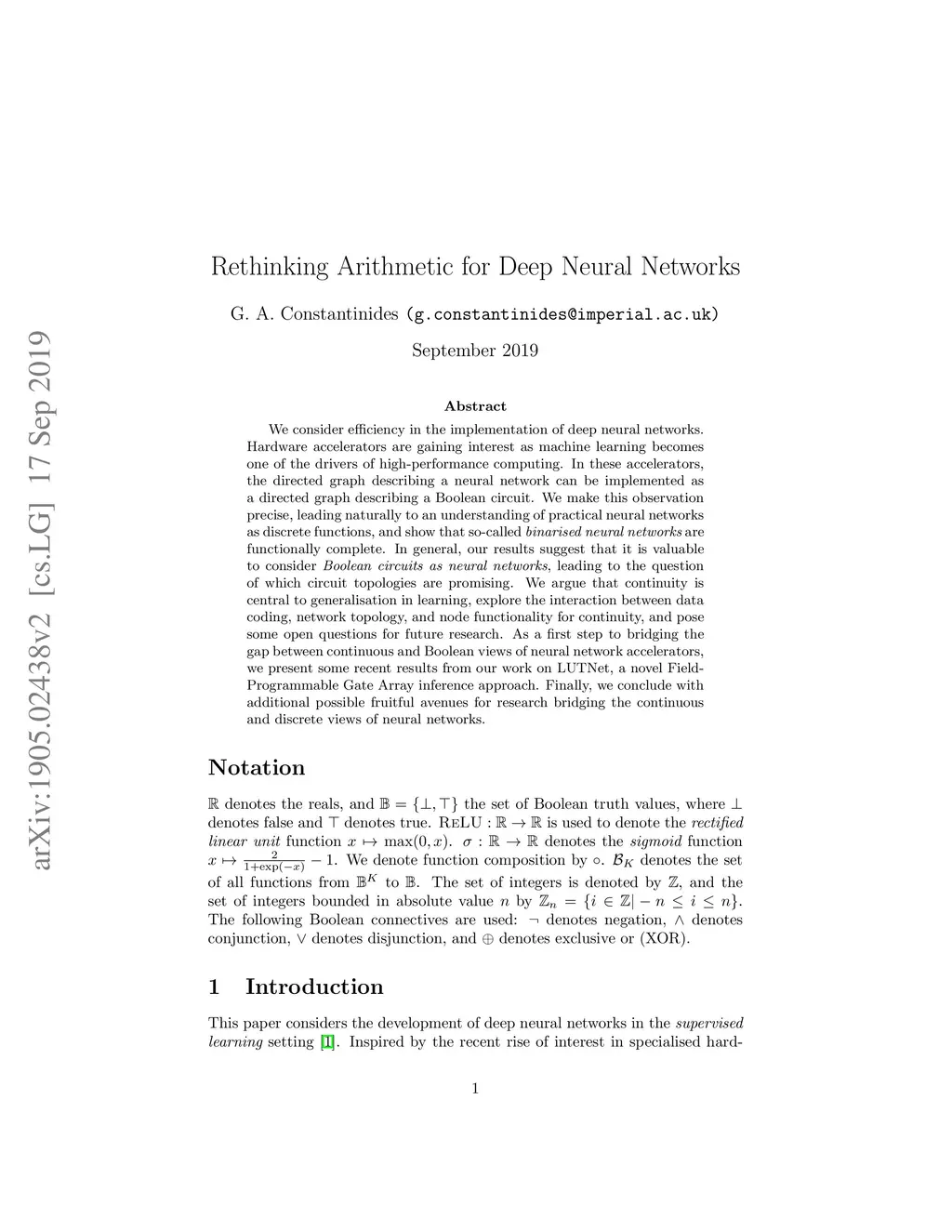 We consider efficiency in the implementation of deep neural networks. Hardware accelerators are gaining interest as machine learning becomes one of the drivers of high-performance computing. In these accelerators, the directed graph describing a neural network can be implemented as a directed graph describing a Boolean circuit. We make this observation precise, leading naturally to an understanding of practical neural networks as discrete functions, and show that so-called binarised neural networks are functionally complete. In general, our results suggest that it is valuable to consider Boolean circuits as neural networks, leading to the question of which circuit topologies are promising. We argue that continuity is central to generalisation in learning, explore the interaction between data coding, network topology, and node functionality for continuity, and pose some open questions for future research. As a first step to bridging the gap between continuous and Boolean views of neural network accelerators, we present some recent results from our work on LUTNet, a novel Field-Programmable Gate Array inference approach. Finally, we conclude with additional possible fruitful avenues for research bridging the continuous and discrete views of neural networks.