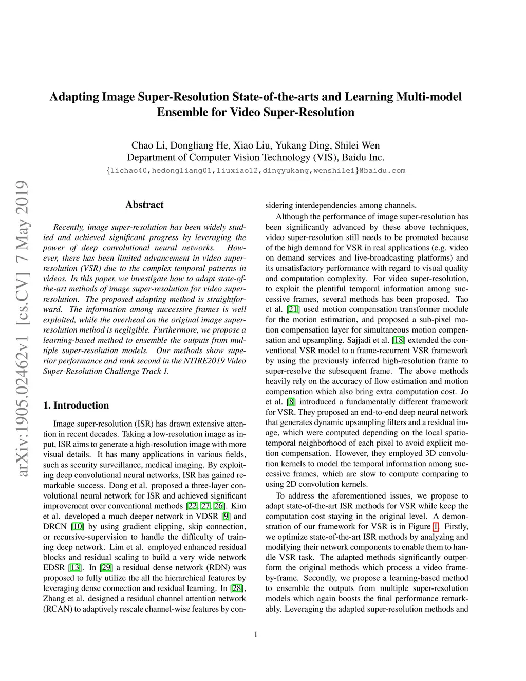 Recently, image super-resolution has been widely studied and achieved significant progress by leveraging the power of deep convolutional neural networks. However, there has been limited advancement in video super-resolution (VSR) due to the complex temporal patterns in videos. In this paper, we investigate how to adapt state-of-the-art methods of image super-resolution for video super-resolution. The proposed adapting method is straightforward. The information among successive frames is well exploited, while the overhead on the original image super-resolution method is negligible. Furthermore, we propose a learning-based method to ensemble the outputs from multiple super-resolution models. Our methods show superior performance and rank second in the NTIRE2019 Video Super-Resolution Challenge Track 1.