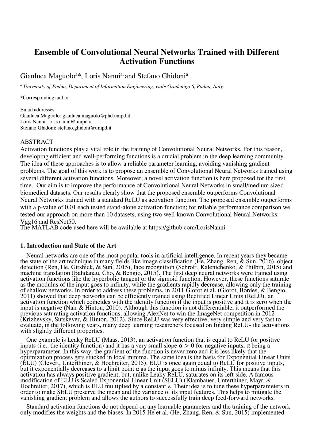 Activation functions play a vital role in the training of Convolutional Neural Networks. For this reason, to develop efficient and performing functions is a crucial problem in the deep learning community. Key to these approaches is to permit a reliable parameter learning, avoiding vanishing gradient problems. The goal of this work is to propose an ensemble of Convolutional Neural Networks trained using several different activation functions. Moreover, a novel activation function is here proposed for the first time. Our aim is to improve the performance of Convolutional Neural Networks in small/medium size biomedical datasets. Our results clearly show that the proposed ensemble outperforms Convolutional Neural Networks trained with standard ReLU as activation function. The proposed ensemble outperforms with a p-value of 0.01 each tested stand-alone activation function; for reliable performance comparison we have tested our approach in more than 10 datasets, using two well-known Convolutional Neural Network: Vgg16 and ResNet50. MATLAB code used here will be available at https://github.com/LorisNanni.