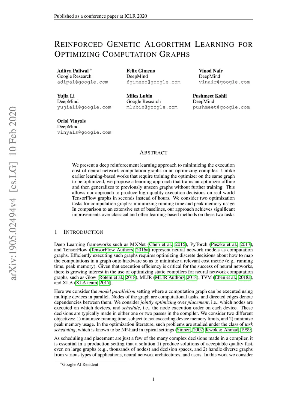 Reinforced Genetic Algorithm Learning for Optimizing Computation Graphs