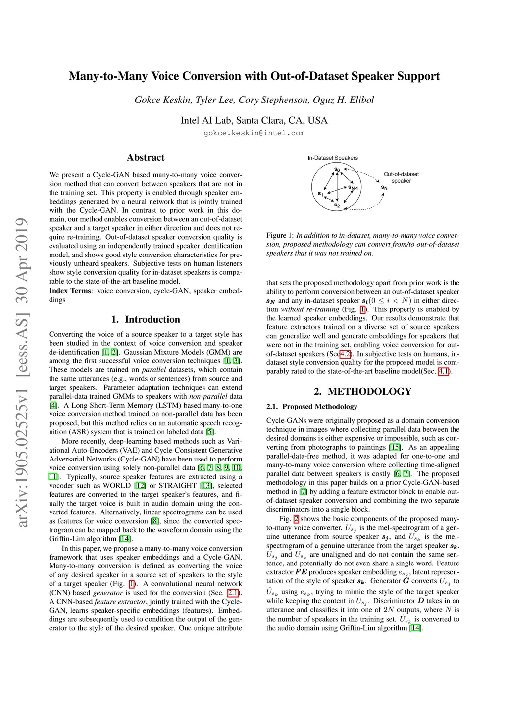 We present a Cycle-GAN based many-to-many voice conversion method that can convert between speakers that are not in the training set. This property is enabled through speaker embeddings generated by a neural network that is jointly trained with the Cycle-GAN. In contrast to prior work in this domain, our method enables conversion between an out-of-dataset speaker and a target speaker in either direction and does not require re-training. Out-of-dataset speaker conversion quality is evaluated using an independently trained speaker identification model, and shows good style conversion characteristics for previously unheard speakers. Subjective tests on human listeners show style conversion quality for in-dataset speakers is comparable to the state-of-the-art baseline model.