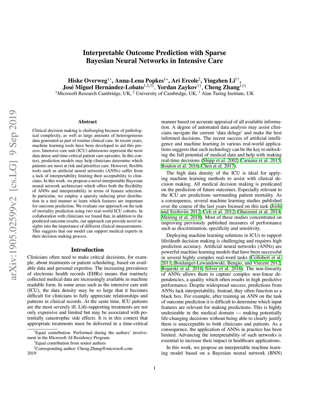 Clinical decision making is challenging because of pathological complexity, as well as large amounts of heterogeneous data generated as part of routine clinical care. In recent years, machine learning tools have been developed to aid this process. Intensive care unit (ICU) admissions represent the most data dense and time-critical patient care episodes. In this context, prediction models may help clinicians determine which patients are most at risk and prioritize care. However, flexible tools such as artificial neural networks (ANNs) suffer from a lack of interpretability limiting their acceptability to clinicians. In this work, we propose a novel interpretable Bayesian neural network architecture which offers both the flexibility of ANNs and interpretability in terms of feature selection. In particular, we employ a sparsity inducing prior distribution in a tied manner to learn which features are important for outcome prediction. We evaluate our approach on the task of mortality prediction using two real-world ICU cohorts. In collaboration with clinicians we found that, in addition to the predicted outcome results, our approach can provide novel insights into the importance of different clinical measurements. This suggests that our model can support medical experts in their decision making process.
