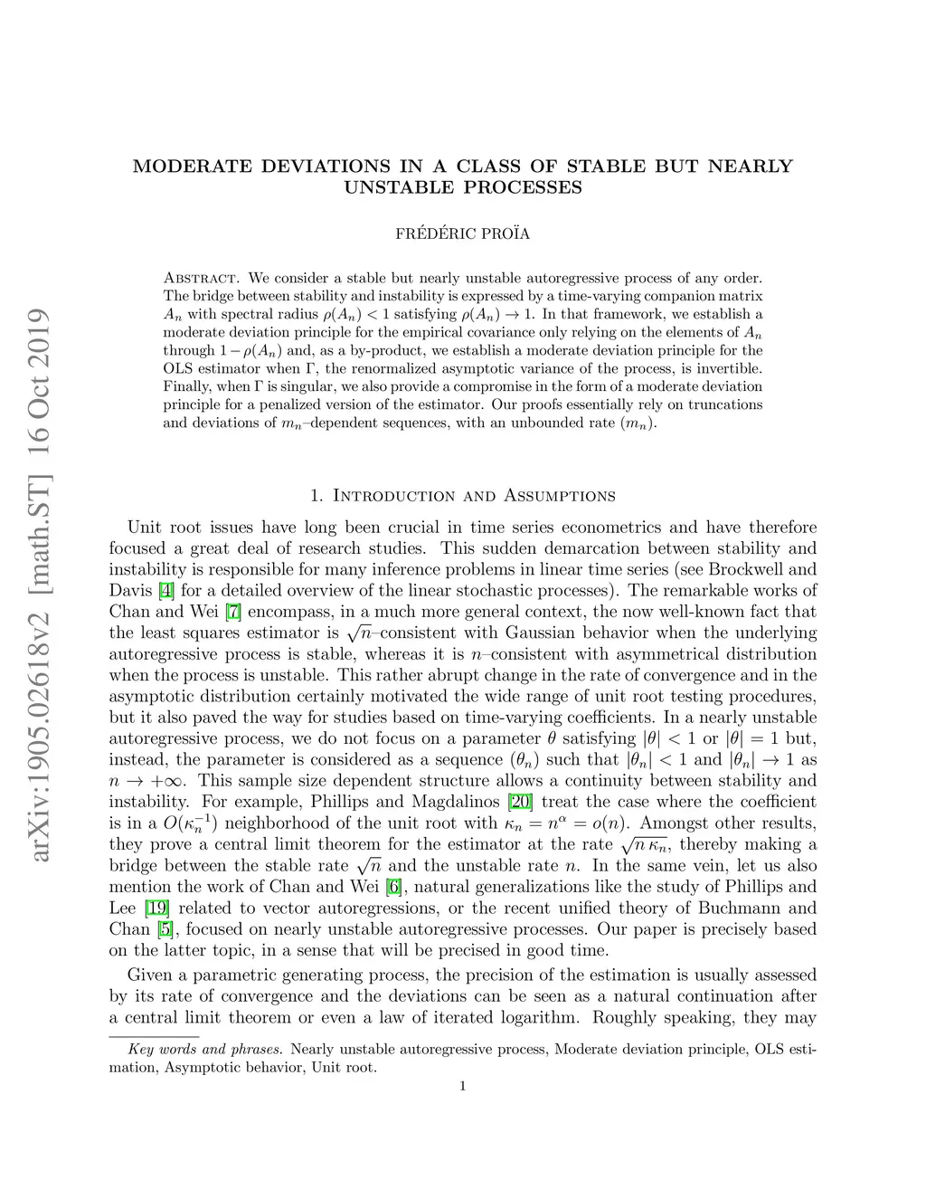 We consider a stable but nearly unstable autoregressive process of any order. The bridge between stability and instability is expressed by a time-varying companion matrix with spectral radius satisfying . In that framework, we establish a moderate deviation principle for the empirical covariance only relying on the elements of through and, as a by-product, we establish a moderate deviation principle for the OLS estimator when , the renormalized asymptotic variance of the process, is invertible. Finally, when is singular, we also provide a compromise in the form of a moderate deviation principle for a penalized version of the estimator. Our proofs essentially rely on truncations and deviations of --dependent sequences, with an unbounded rate .