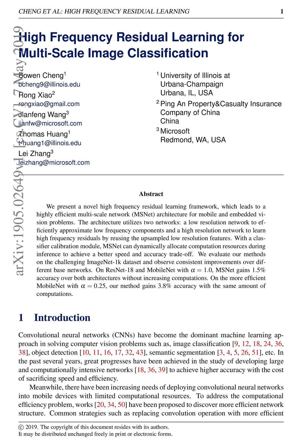 We present a novel high frequency residual learning framework, which leads to a highly efficient multi-scale network (MSNet) architecture for mobile and embedded vision problems. The architecture utilizes two networks: a low resolution network to efficiently approximate low frequency components and a high resolution network to learn high frequency residuals by reusing the upsampled low resolution features. With a classifier calibration module, MSNet can dynamically allocate computation resources during inference to achieve a better speed and accuracy trade-off. We evaluate our methods on the challenging ImageNet-1k dataset and observe consistent improvements over different base networks. On ResNet-18 and MobileNet with alpha=1.0, MSNet gains 1.5% accuracy over both architectures without increasing computations. On the more efficient MobileNet with alpha=0.25, our method gains 3.8% accuracy with the same amount of computations.