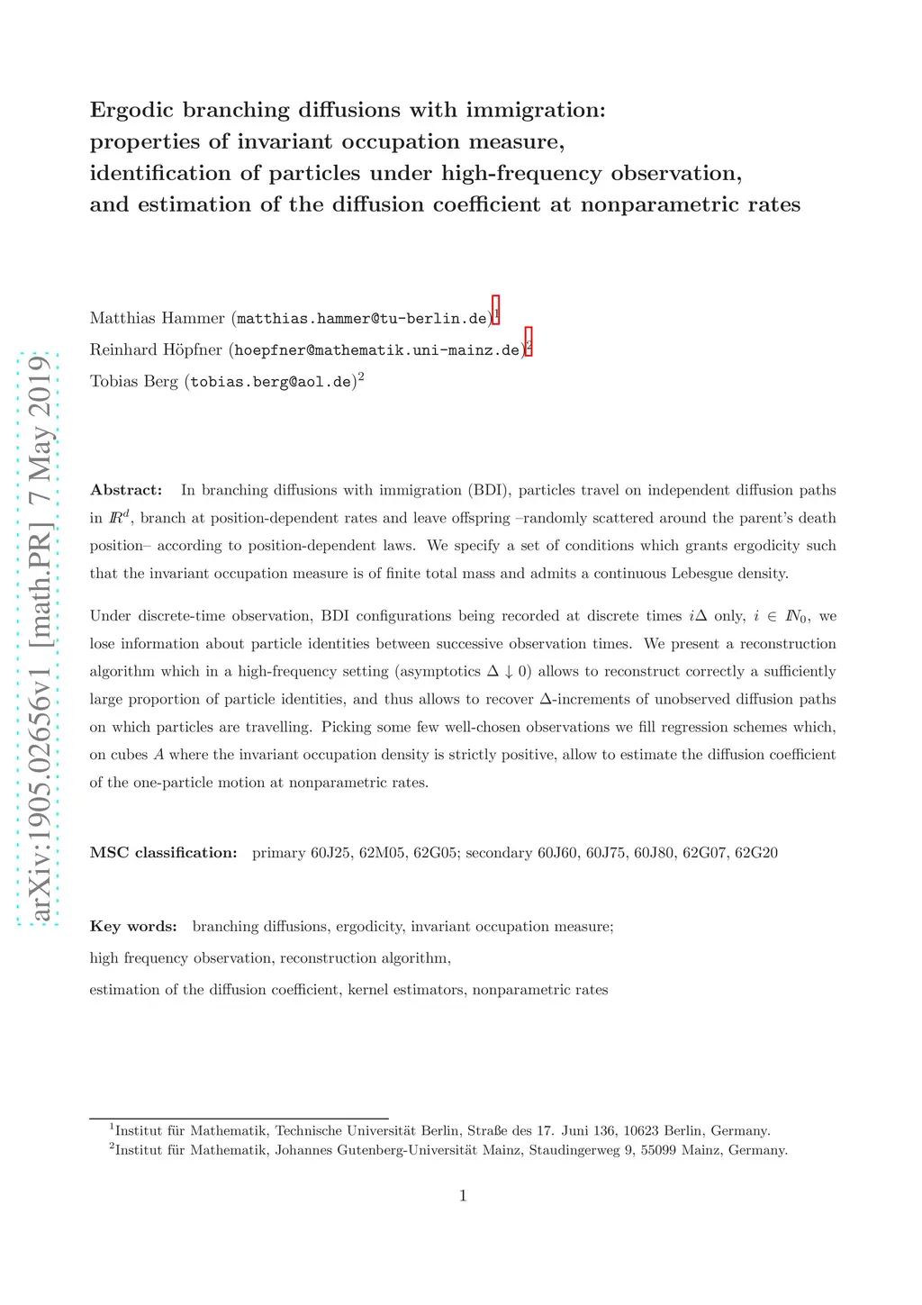 In branching diffusions with immigration (BDI), particles travel on independent diffusion paths in , branch at position-dependent rates and leave offspring -- randomly scattered around the parent's death position -- according to position-dependent laws. We specify a set of conditions which grants ergodicity such that the invariant occupation measure is of finite total mass and admits a continuous Lebesgue density. Under discrete-time observation, BDI configurations being recorded at discrete times only, , we lose information about particle identities between successive observation times. We present a reconstruction algorithm which in a high-frequency setting (asymptotics ) allows to reconstruct correctly a sufficiently large proportion of particle identities, and thus allows to recover -increments of unobserved diffusion paths on which particles are travelling. Picking some few well-chosen observations we fill regression schemes which, on cubes where the invariant occupation density is strictly positive, allow to estimate the diffusion coefficient of the one-particle motion at nonparametric rates.