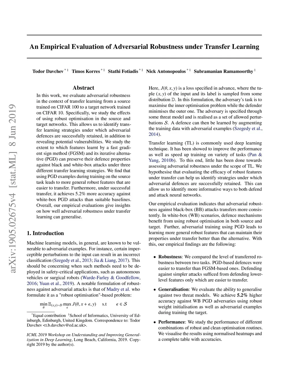 In this work, we evaluate adversarial robustness in the context of transfer learning from a source trained on CIFAR 100 to a target network trained on CIFAR 10. Specifically, we study the effects of using robust optimisation in the source and target networks. This allows us to identify transfer learning strategies under which adversarial defences are successfully retained, in addition to revealing potential vulnerabilities. We study the extent to which features learnt by a fast gradient sign method (FGSM) and its iterative alternative (PGD) can preserve their defence properties against black and white-box attacks under three different transfer learning strategies. We find that using PGD examples during training on the source task leads to more general robust features that are easier to transfer. Furthermore, under successful transfer, it achieves 5.2% more accuracy against white-box PGD attacks than suitable baselines. Overall, our empirical evaluations give insights on how well adversarial robustness under transfer learning can generalise.