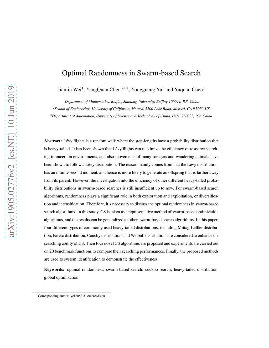 L\'{e}vy flights is a random walk where the step-lengths have a probability distribution that is heavy-tailed. It has been shown that L\'{e}vy flights can maximize the efficiency of resource searching in uncertain environments, and also movements of many foragers and wandering animals have been shown to follow a L\'{e}vy distribution. The reason mainly comes from that the L\'{e}vy distribution, has an infinite second moment, and hence is more likely to generate an offspring that is farther away from its parent. However, the investigation into the efficiency of other different heavy-tailed probability distributions in swarm-based searches is still insufficient up to now. For swarm-based search algorithms, randomness plays a significant role in both exploration and exploitation, or diversification and intensification. Therefore, it's necessary to discuss the optimal randomness in swarm-based search algorithms. In this study, CS is taken as a representative method of swarm-based optimization algorithms, and the results can be generalized to other swarm-based search algorithms. In this paper, four different types of commonly used heavy-tailed distributions, including Mittag-Leffler distribution, Pareto distribution, Cauchy distribution, and Weibull distribution, are considered to enhance the searching ability of CS. Then four novel CS algorithms are proposed and experiments are carried out on 20 benchmark functions to compare their searching performances. Finally, the proposed methods are used to system identification to demonstrate the effectiveness.