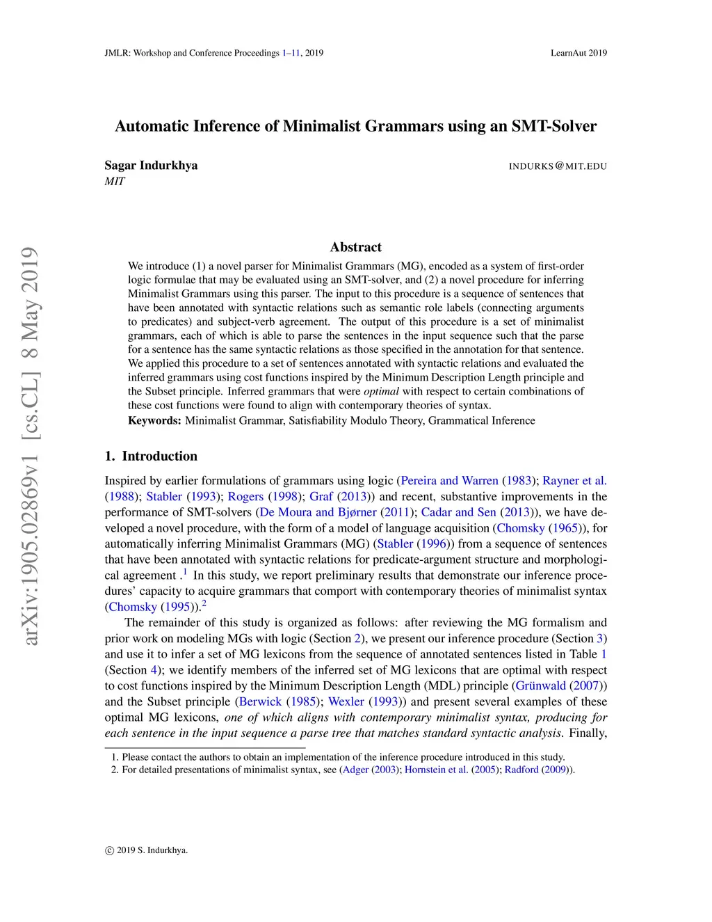 We introduce (1) a novel parser for Minimalist Grammars (MG), encoded as a system of first-order logic formulae that may be evaluated using an SMT-solver, and (2) a novel procedure for inferring Minimalist Grammars using this parser. The input to this procedure is a sequence of sentences that have been annotated with syntactic relations such as semantic role labels (connecting arguments to predicates) and subject-verb agreement. The output of this procedure is a set of minimalist grammars, each of which is able to parse the sentences in the input sequence such that the parse for a sentence has the same syntactic relations as those specified in the annotation for that sentence. We applied this procedure to a set of sentences annotated with syntactic relations and evaluated the inferred grammars using cost functions inspired by the Minimum Description Length principle and the Subset principle. Inferred grammars that were optimal with respect to certain combinations of these cost functions were found to align with contemporary theories of syntax.