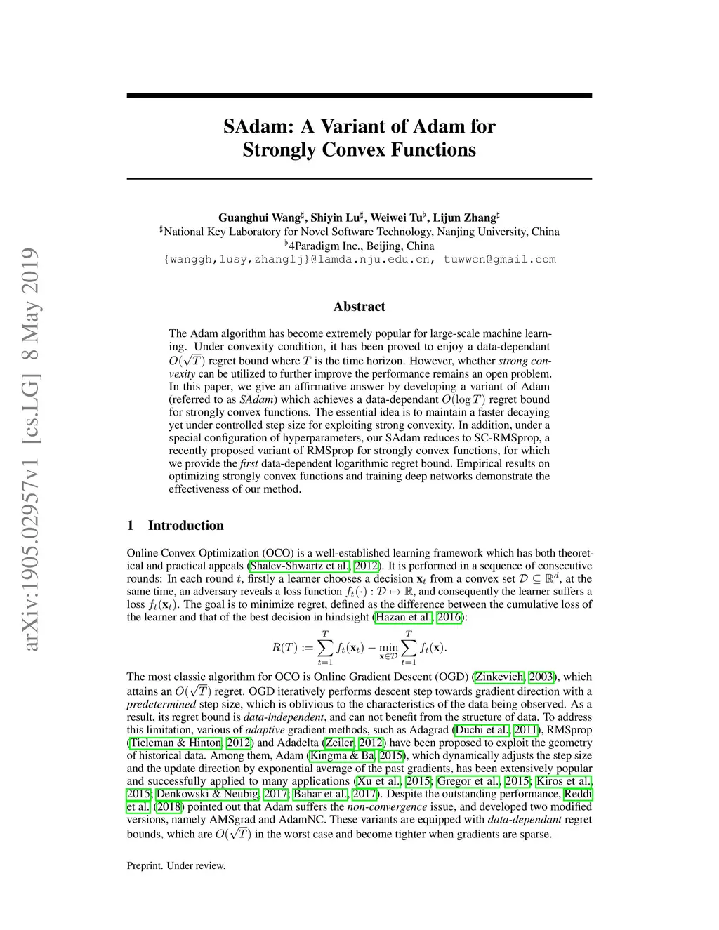 SAdam: A Variant of Adam for Strongly Convex Functions