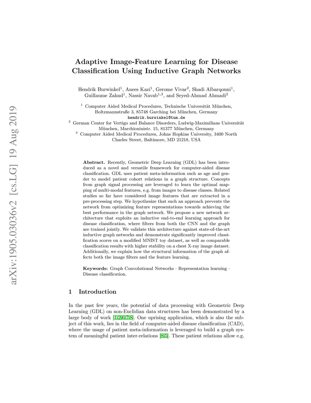 Recently, Geometric Deep Learning (GDL) has been introduced as a novel and versatile framework for computer-aided disease classification. GDL uses patient meta-information such as age and gender to model patient cohort relations in a graph structure. Concepts from graph signal processing are leveraged to learn the optimal mapping of multi-modal features, e.g. from images to disease classes. Related studies so far have considered image features that are extracted in a pre-processing step. We hypothesize that such an approach prevents the network from optimizing feature representations towards achieving the best performance in the graph network. We propose a new network architecture that exploits an inductive end-to-end learning approach for disease classification, where filters from both the CNN and the graph are trained jointly. We validate this architecture against state-of-the-art inductive graph networks and demonstrate significantly improved classification scores on a modified MNIST toy dataset, as well as comparable classification results with higher stability on a chest X-ray image dataset. Additionally, we explain how the structural information of the graph affects both the image filters and the feature learning.