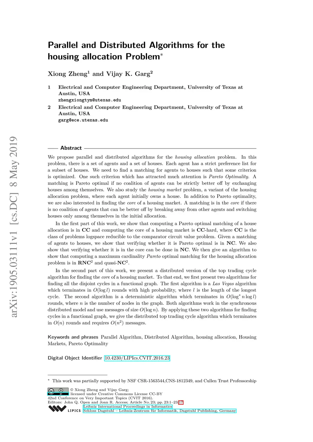 We give parallel and distributed algorithms for the housing allocation problem. In this problem, there is a set of agents and a set of houses. Each agent has a strict preference list for a subset of houses. We need to find a matching such that some criterion is optimized. One such criterion is Pareto Optimality. A matching is Pareto optimal if no coalition of agents can be strictly better off by exchanging houses among themselves. We also study the housing market problem, a variant of the housing allocation problem, where each agent initially owns a house. In addition to Pareto optimality, we are also interested in finding the core of a housing market. A matching is in the core if there is no coalition of agents that can be better off by breaking away from other agents and switching houses only among themselves. In the first part of this work, we show that computing a Pareto optimal matching of a house allocation is in {\bf CC} and computing the core of a housing market is {\bf CC}-hard. Given a matching, we also show that verifying whether it is in the core can be done in {\bf NC}. We then give an algorithm to show that computing a maximum Pareto optimal matching for the housing allocation problem is in {\bf RNC}^2 and quasi-{\bf NC}^2. In the second part of this work, we present a distributed version of the top trading cycle algorithm for finding the core of a housing market. To that end, we first present two algorithms for finding all the disjoint cycles in a functional graph: a Las Vegas algorithm which terminates in rounds with high probability, where is the length of the longest cycle, and a deterministic algorithm which terminates in rounds, where is the number of nodes in the graph. Both algorithms work in the synchronous distributed model and use messages of size .