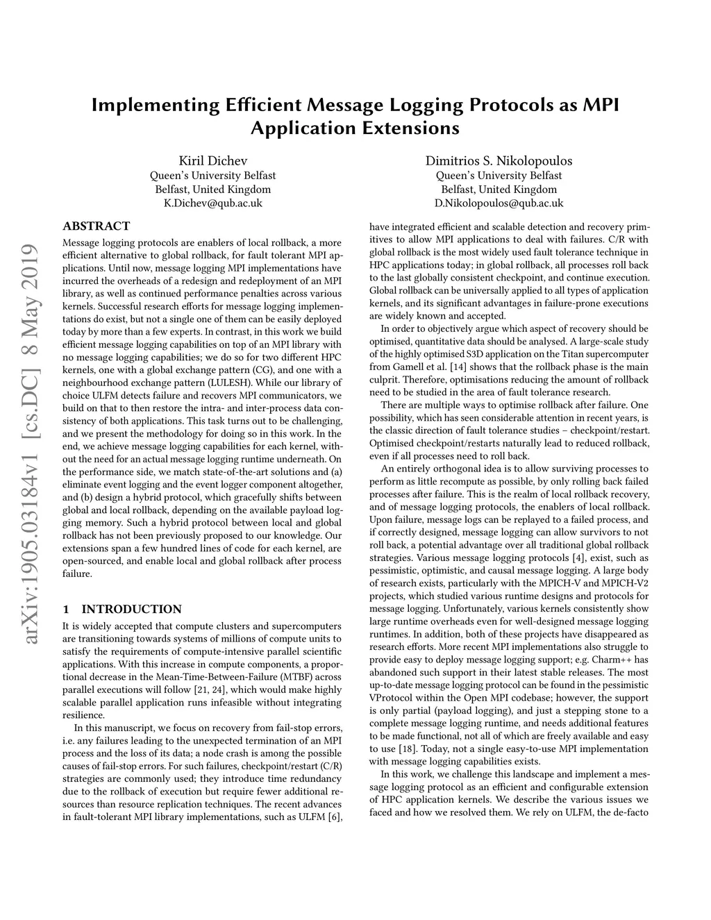 Message logging protocols are enablers of local rollback, a more efficient alternative to global rollback, for fault tolerant MPI applications. Until now, message logging MPI implementations have incurred the overheads of a redesign and redeployment of an MPI library, as well as continued performance penalties across various kernels. Successful research efforts for message logging implementations do exist, but not a single one of them can be easily deployed today by more than a few experts. In contrast, in this work we build efficient message logging capabilities on top of an MPI library with no message logging capabilities; we do so for two different HPC kernels, one with a global exchange pattern (CG), and one with a neighbourhood exchange pattern (LULESH). While our library of choice ULFM detects failure and recovers MPI communicators, we build on that to then restore the intra- and inter-process data consistency of both applications. This task turns out to be challenging, and we present the methodology for doing so in this work. In the end, we achieve message logging capabilities for each kernel, without the need for an actual message logging runtime underneath. On the performance side, we match state-of-the-art solutions and (a) eliminate event logging and the event logger component altogether, and (b) design a hybrid protocol, which gracefully shifts between global and local rollback, depending on the available payload logging memory. Such a hybrid protocol between local and global rollback has not been previously proposed to our knowledge. Our extensions span a few hundred lines of code for each kernel, are open-sourced, and enable local and global rollback after process failure.