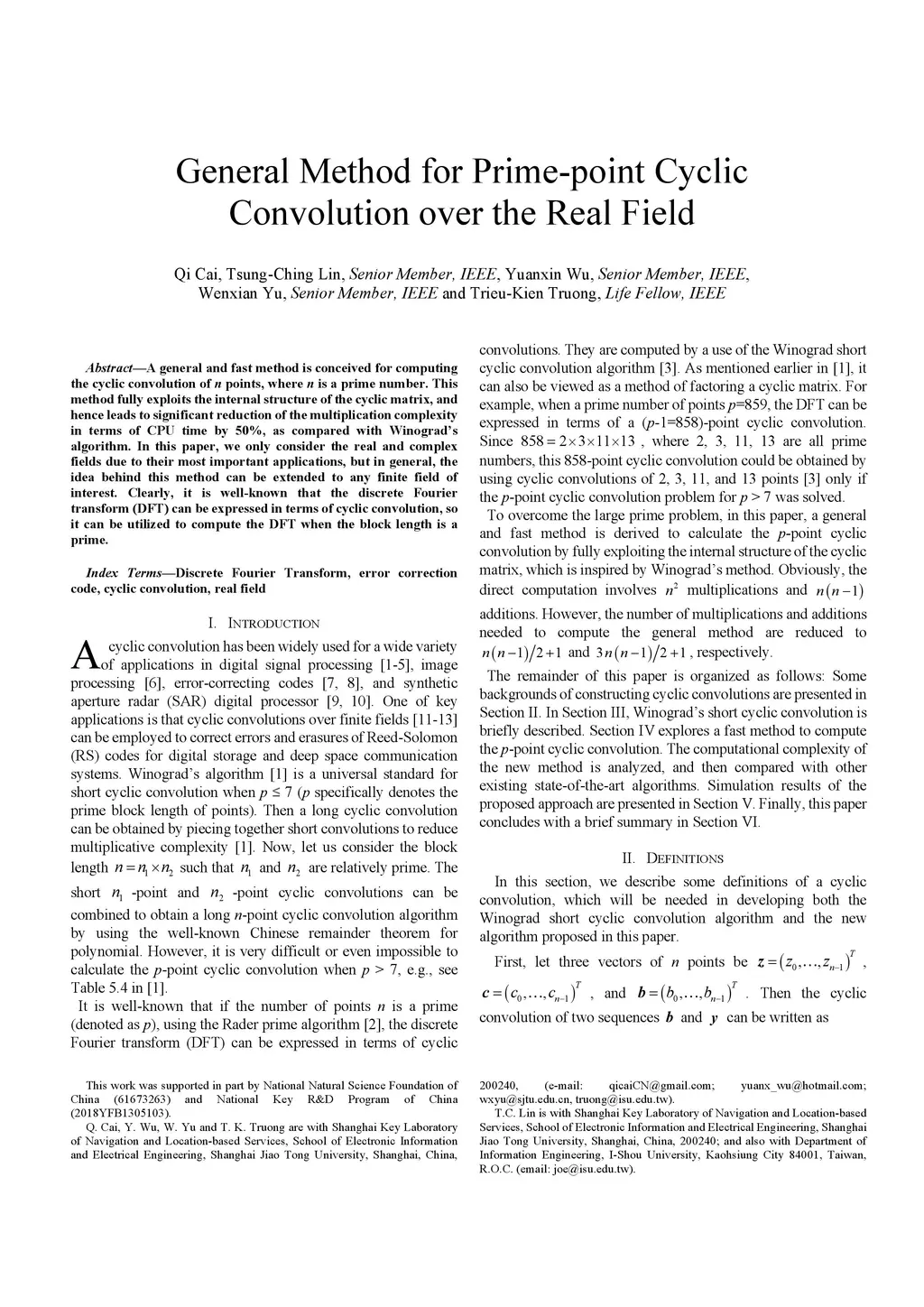 A general and fast method is conceived for computing the cyclic convolution of n points, where n is a prime number. This method fully exploits the internal structure of the cyclic matrix, and hence leads to significant reduction of the multiplication complexity in terms of CPU time by 50%, as compared with Winograd's algorithm. In this paper, we only consider the real and complex fields due to their most important applications, but in general, the idea behind this method can be extended to any finite field of interest. Clearly, it is well-known that the discrete Fourier transform (DFT) can be expressed in terms of cyclic convolution, so it can be utilized to compute the DFT when the block length is a prime.