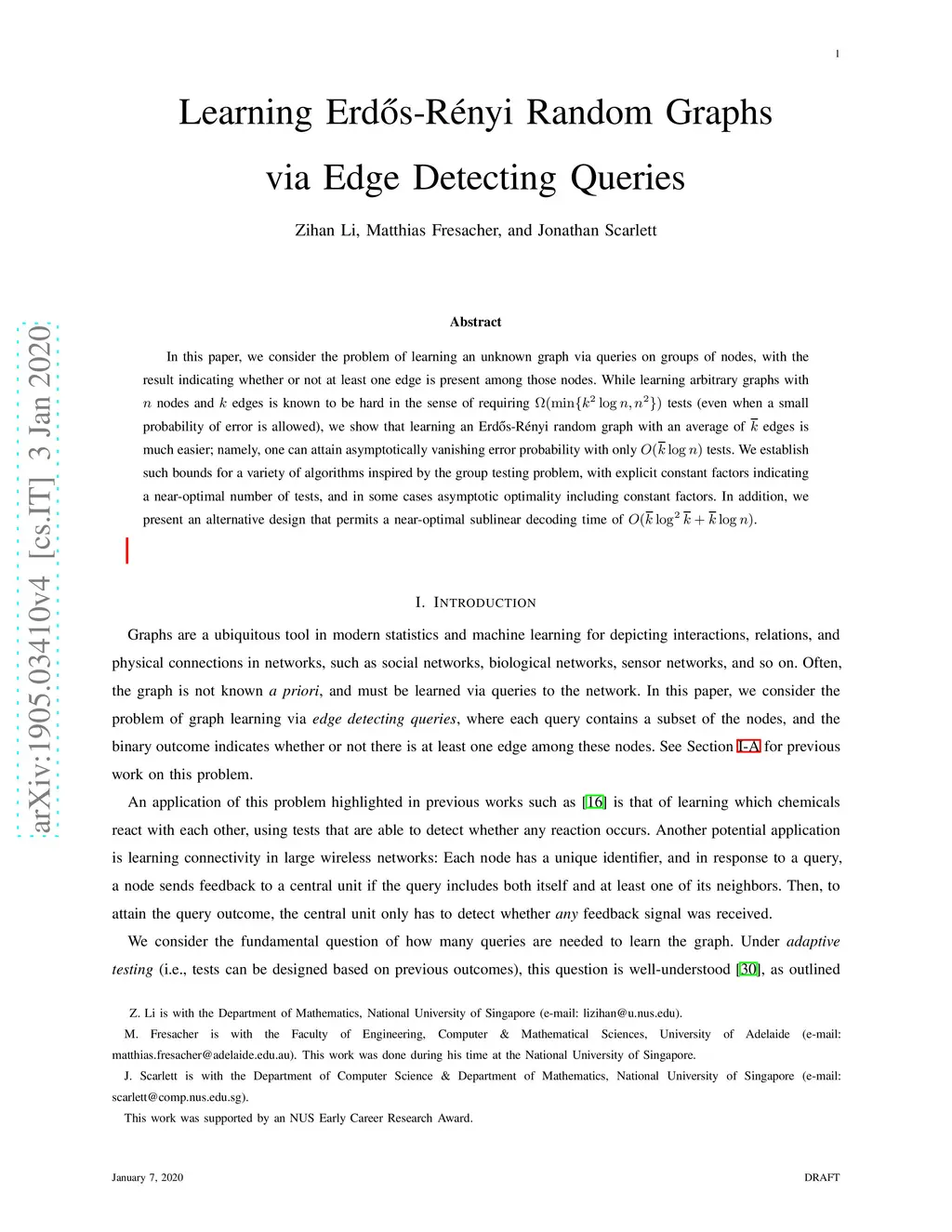 Learning Erdős-Rényi Random Graphs via Edge Detecting Queries
