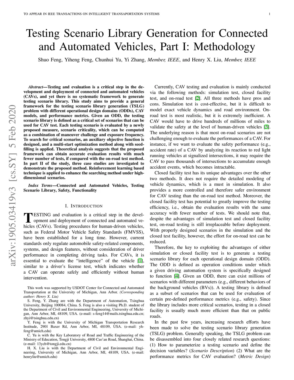 Testing and evaluation is a critical step in the development and deployment of connected and automated vehicles (CAVs), and yet there is no systematic framework to generate testing scenario library. This study aims to provide a general framework for the testing scenario library generation (TSLG) problem with different operational design domains (ODDs), CAV models, and performance metrics. Given an ODD, the testing scenario library is defined as a critical set of scenarios that can be used for CAV test. Each testing scenario is evaluated by a newly proposed measure, scenario criticality, which can be computed as a combination of maneuver challenge and exposure frequency. To search for critical scenarios, an auxiliary objective function is designed, and a multi-start optimization method along with seed-filling is applied. The proposed framework is theoretically proved to obtain accurate evaluation results with much fewer number of tests, if compared with the on-road test method. In part II of the study, three case studies are investigated to demonstrate the proposed methodologies. Reinforcement learning based technique is applied to enhance the searching method under high-dimensional scenarios.