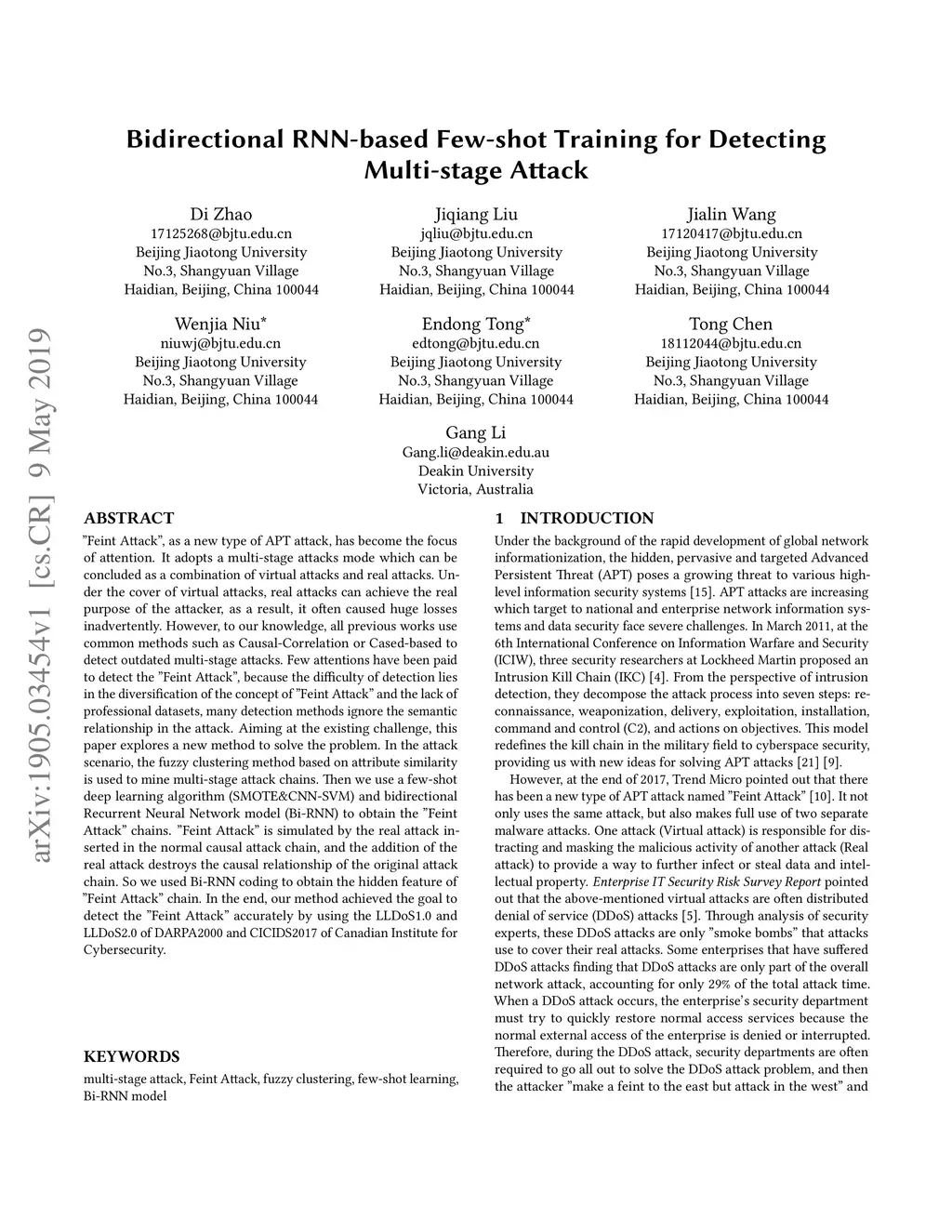 "Feint Attack", as a new type of APT attack, has become the focus of attention. It adopts a multi-stage attacks mode which can be concluded as a combination of virtual attacks and real attacks. Under the cover of virtual attacks, real attacks can achieve the real purpose of the attacker, as a result, it often caused huge losses inadvertently. However, to our knowledge, all previous works use common methods such as Causal-Correlation or Cased-based to detect outdated multi-stage attacks. Few attentions have been paid to detect the "Feint Attack", because the difficulty of detection lies in the diversification of the concept of "Feint Attack" and the lack of professional datasets, many detection methods ignore the semantic relationship in the attack. Aiming at the existing challenge, this paper explores a new method to solve the problem. In the attack scenario, the fuzzy clustering method based on attribute similarity is used to mine multi-stage attack chains. Then we use a few-shot deep learning algorithm (SMOTE&CNN-SVM) and bidirectional Recurrent Neural Network model (Bi-RNN) to obtain the "Feint Attack" chains. "Feint Attack" is simulated by the real attack inserted in the normal causal attack chain, and the addition of the real attack destroys the causal relationship of the original attack chain. So we used Bi-RNN coding to obtain the hidden feature of "Feint Attack" chain. In the end, our method achieved the goal to detect the "Feint Attack" accurately by using the LLDoS1.0 and LLDoS2.0 of DARPA2000 and CICIDS2017 of Canadian Institute for Cybersecurity.