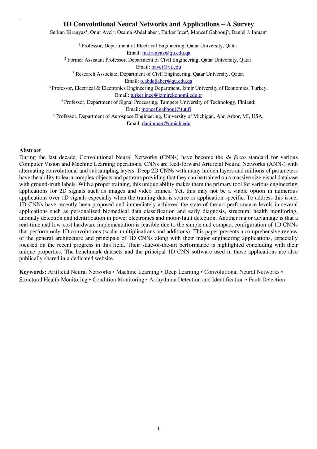 During the last decade, Convolutional Neural Networks (CNNs) have become the de facto standard for various Computer Vision and Machine Learning operations. CNNs are feed-forward Artificial Neural Networks (ANNs) with alternating convolutional and subsampling layers. Deep 2D CNNs with many hidden layers and millions of parameters have the ability to learn complex objects and patterns providing that they can be trained on a massive size visual database with ground-truth labels. With a proper training, this unique ability makes them the primary tool for various engineering applications for 2D signals such as images and video frames. Yet, this may not be a viable option in numerous applications over 1D signals especially when the training data is scarce or application-specific. To address this issue, 1D CNNs have recently been proposed and immediately achieved the state-of-the-art performance levels in several applications such as personalized biomedical data classification and early diagnosis, structural health monitoring, anomaly detection and identification in power electronics and motor-fault detection. Another major advantage is that a real-time and low-cost hardware implementation is feasible due to the simple and compact configuration of 1D CNNs that perform only 1D convolutions (scalar multiplications and additions). This paper presents a comprehensive review of the general architecture and principals of 1D CNNs along with their major engineering applications, especially focused on the recent progress in this field. Their state-of-the-art performance is highlighted concluding with their unique properties. The benchmark datasets and the principal 1D CNN software used in those applications are also publically shared in a dedicated website.