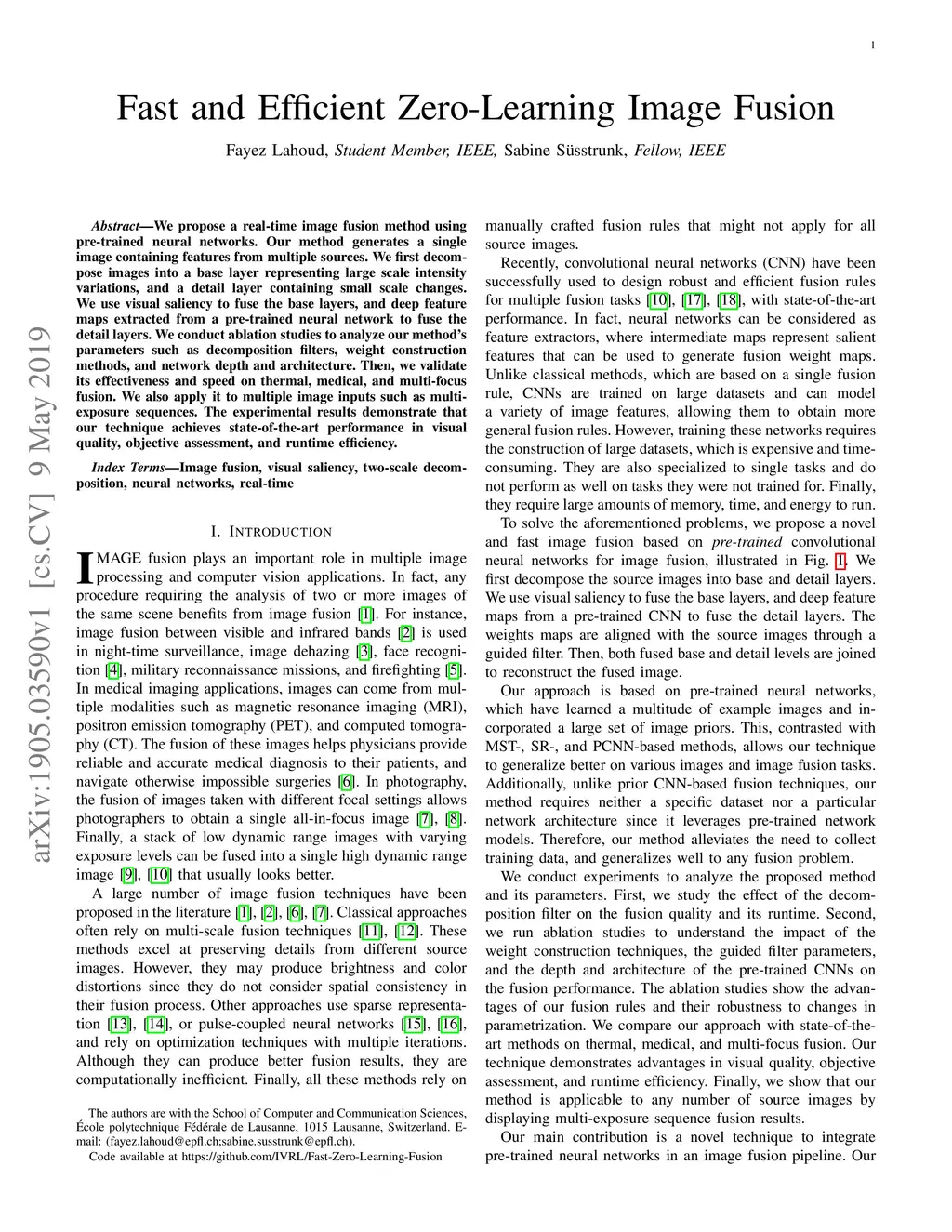 We propose a real-time image fusion method using pre-trained neural networks. Our method generates a single image containing features from multiple sources. We first decompose images into a base layer representing large scale intensity variations, and a detail layer containing small scale changes. We use visual saliency to fuse the base layers, and deep feature maps extracted from a pre-trained neural network to fuse the detail layers. We conduct ablation studies to analyze our method's parameters such as decomposition filters, weight construction methods, and network depth and architecture. Then, we validate its effectiveness and speed on thermal, medical, and multi-focus fusion. We also apply it to multiple image inputs such as multi-exposure sequences. The experimental results demonstrate that our technique achieves state-of-the-art performance in visual quality, objective assessment, and runtime efficiency.
