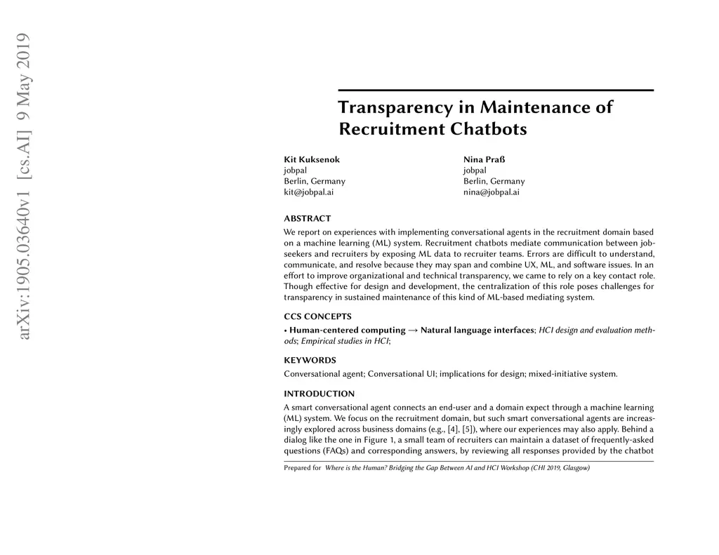 We report on experiences with implementing conversational agents in the recruitment domain based on a machine learning (ML) system. Recruitment chatbots mediate communication between job-seekers and recruiters by exposing ML data to recruiter teams. Errors are difficult to understand, communicate, and resolve because they may span and combine UX, ML, and software issues. In an effort to improve organizational and technical transparency, we came to rely on a key contact role. Though effective for design and development, the centralization of this role poses challenges for transparency in sustained maintenance of this kind of ML-based mediating system.