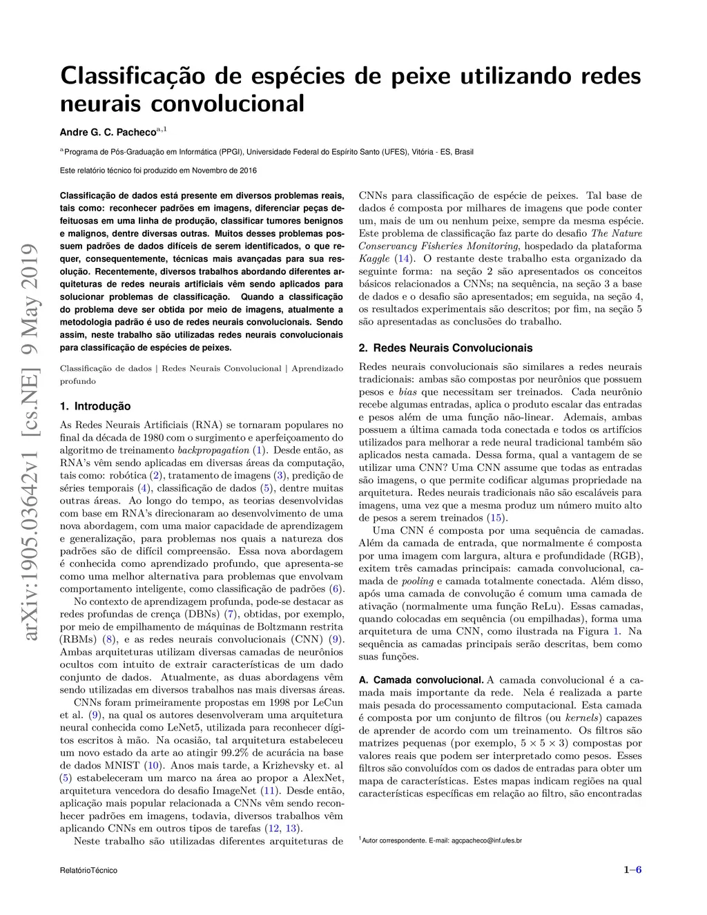 Data classification is present in different real problems, such as recognizing patterns in images, differentiating defective parts in a production line, classifying benign and malignant tumors, among many others. Many of these problems have data patterns that are hard to identify, which requires more advanced techniques for resolution. Recently, several works addressing different artificial neural network architectures have been applied to solve classification problems. When the classification problem must be obtained through images, currently, the standard methodology is the use of convolutional neural networks. Thus, in this report convolutional neural networks are used to classify fish species. Classifica\c{c}\~ao de dados est\á presente em diversos problemas reais, tais como: reconhecer padr\~oes em imagens, diferenciar pe\c{c}as defeituosas em uma linha de produ\c{c}\~ao, classificar tumores benignos e malignos, dentre diversas outras. Muitos desses problemas possuem padr\~oes de dados dif\íceis de serem identificados, o que requer, consequentemente, t\écnicas mais avan\c{c}adas para sua resolu\c{c}\~ao. Recentemente, diversos trabalhos abordando diferentes arquiteturas de redes neurais artificiais v\^em sendo aplicados para solucionar problemas de classifica\c{c}\~ao. Quando a classifica\c{c}\~ao do problema deve ser obtida por meio de imagens, atualmente a metodologia padr\~ao \é uso de redes neurais convolucionais. Sendo assim, neste trabalho s\~ao utilizadas redes neurais convolucionais para classifica\c{c}\~ao de esp\écies de peixes.