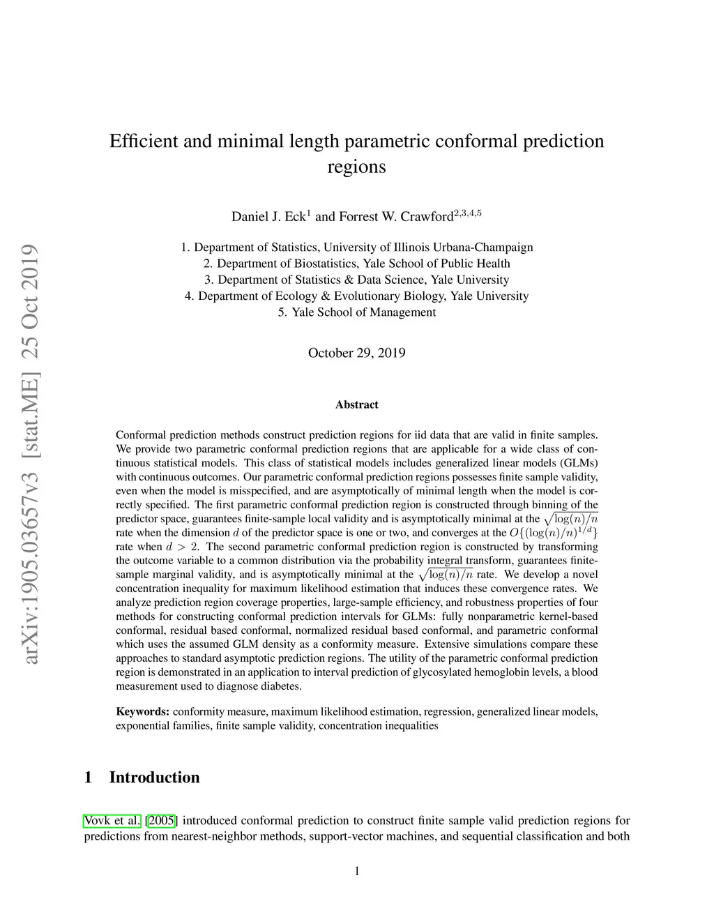 Conformal prediction methods construct prediction regions for iid data that are valid in finite samples. We provide two parametric conformal prediction regions that are applicable for a wide class of continuous statistical models. This class of statistical models includes generalized linear models (GLMs) with continuous outcomes. Our parametric conformal prediction regions possesses finite sample validity, even when the model is misspecified, and are asymptotically of minimal length when the model is correctly specified. The first parametric conformal prediction region is constructed through binning of the predictor space, guarantees finite-sample local validity and is asymptotically minimal at the rate when the dimension of the predictor space is one or two, and converges at the rate when . The second parametric conformal prediction region is constructed by transforming the outcome variable to a common distribution via the probability integral transform, guarantees finite-sample marginal validity, and is asymptotically minimal at the rate. We develop a novel concentration inequality for maximum likelihood estimation that induces these convergence rates. We analyze prediction region coverage properties, large-sample efficiency, and robustness properties of four methods for constructing conformal prediction intervals for GLMs: fully nonparametric kernel-based conformal, residual based conformal, normalized residual based conformal, and parametric conformal which uses the assumed GLM density as a conformity measure. Extensive simulations compare these approaches to standard asymptotic prediction regions. The utility of the parametric conformal prediction region is demonstrated in an application to interval prediction of glycosylated hemoglobin levels, a blood measurement used to diagnose diabetes.