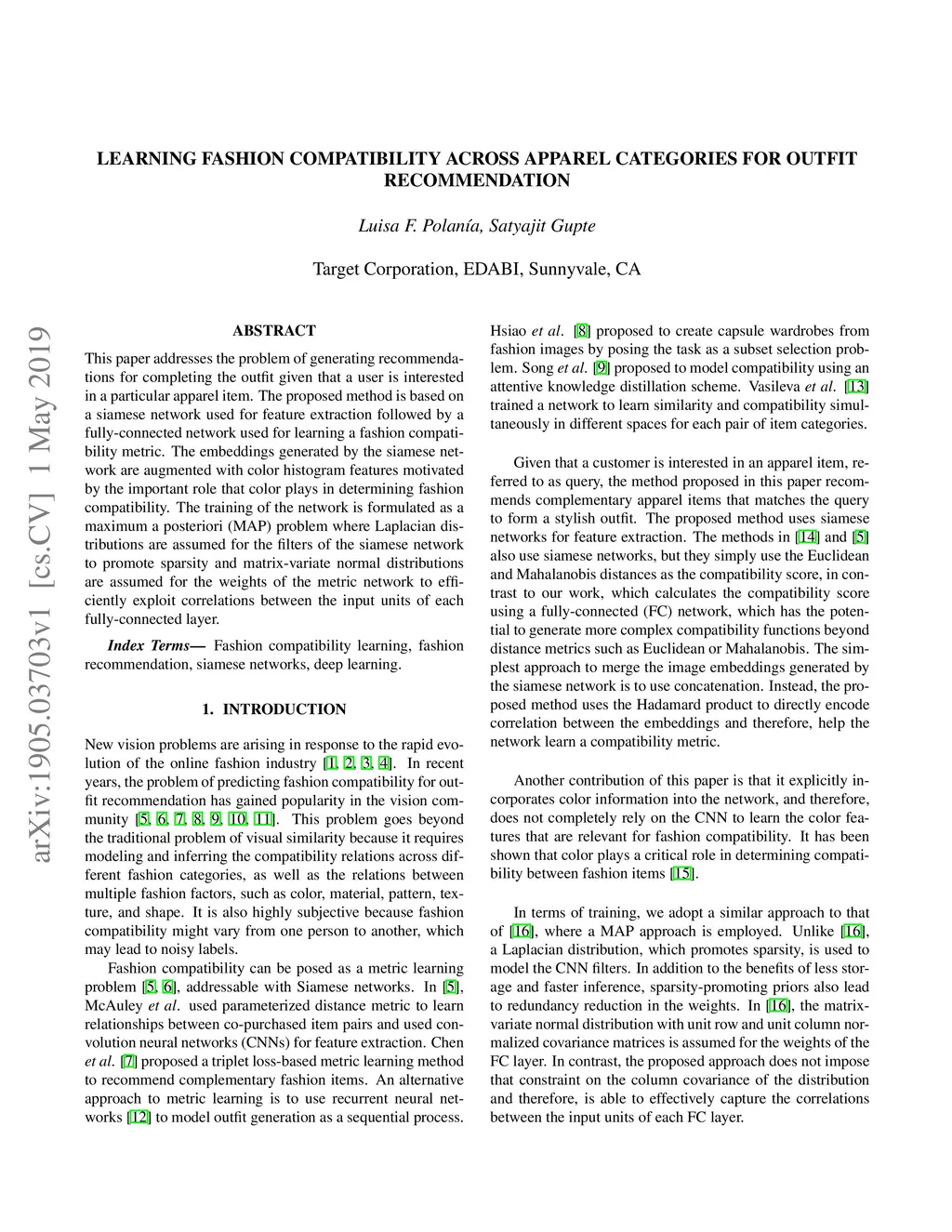 This paper addresses the problem of generating recommendations for completing the outfit given that a user is interested in a particular apparel item. The proposed method is based on a siamese network used for feature extraction followed by a fully-connected network used for learning a fashion compatibility metric. The embeddings generated by the siamese network are augmented with color histogram features motivated by the important role that color plays in determining fashion compatibility. The training of the network is formulated as a maximum a posteriori (MAP) problem where Laplacian distributions are assumed for the filters of the siamese network to promote sparsity and matrix-variate normal distributions are assumed for the weights of the metric network to efficiently exploit correlations between the input units of each fully-connected layer.