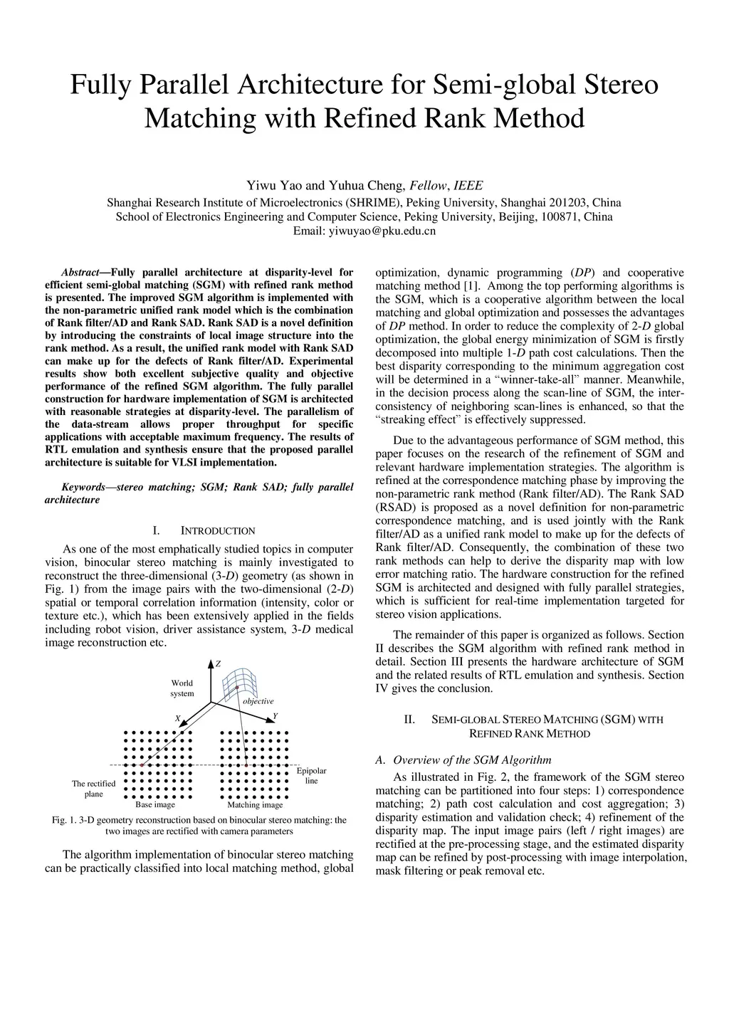 Fully parallel architecture at disparity-level for efficient semi-global matching (SGM) with refined rank method is presented. The improved SGM algorithm is implemented with the non-parametric unified rank model which is the combination of Rank filter/AD and Rank SAD. Rank SAD is a novel definition by introducing the constraints of local image structure into the rank method. As a result, the unified rank model with Rank SAD can make up for the defects of Rank filter/AD. Experimental results show both excellent subjective quality and objective performance of the refined SGM algorithm. The fully parallel construction for hardware implementation of SGM is architected with reasonable strategies at disparity-level. The parallelism of the data-stream allows proper throughput for specific applications with acceptable maximum frequency. The results of RTL emulation and synthesis ensure that the proposed parallel architecture is suitable for VLSI implementation.
