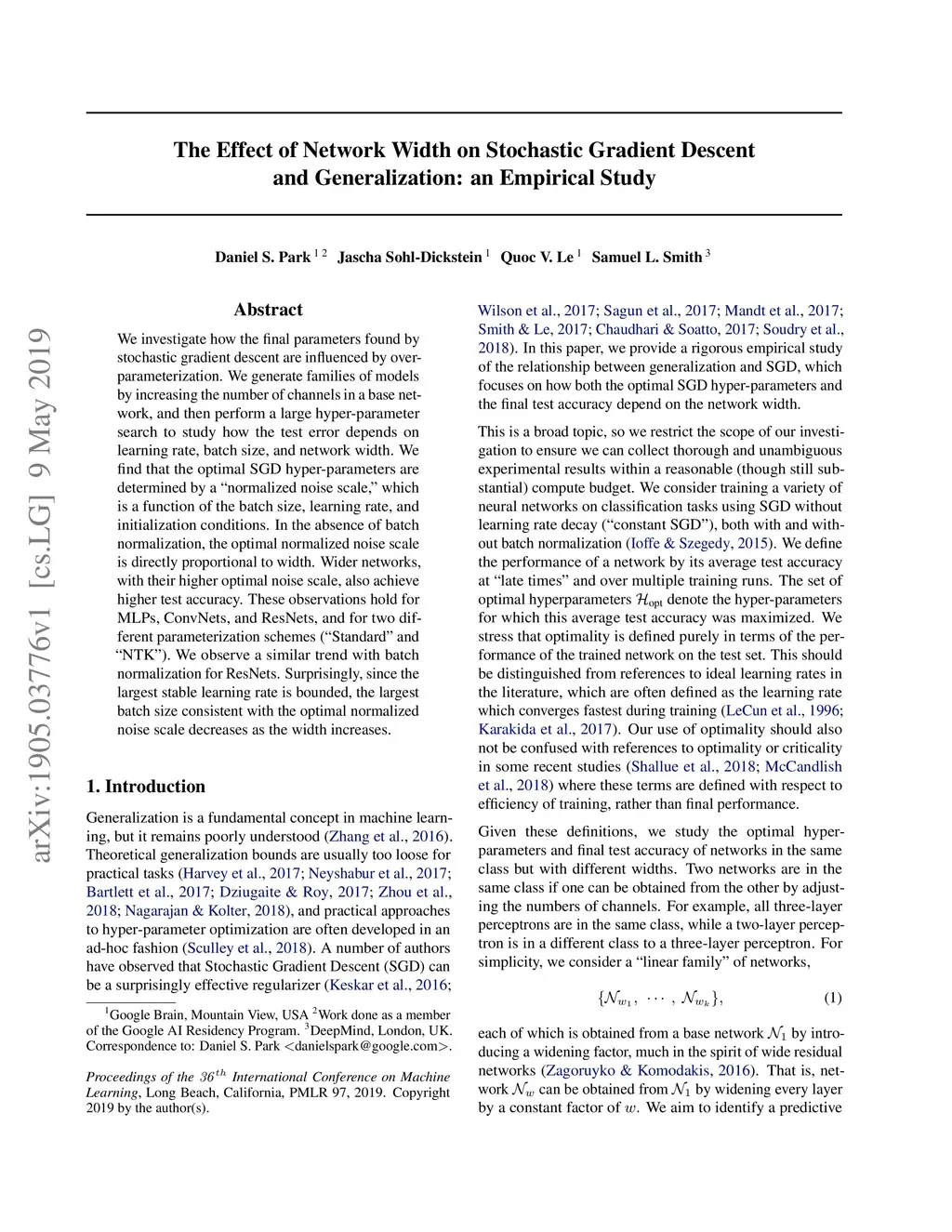 We investigate how the final parameters found by stochastic gradient descent are influenced by over-parameterization. We generate families of models by increasing the number of channels in a base network, and then perform a large hyper-parameter search to study how the test error depends on learning rate, batch size, and network width. We find that the optimal SGD hyper-parameters are determined by a "normalized noise scale," which is a function of the batch size, learning rate, and initialization conditions. In the absence of batch normalization, the optimal normalized noise scale is directly proportional to width. Wider networks, with their higher optimal noise scale, also achieve higher test accuracy. These observations hold for MLPs, ConvNets, and ResNets, and for two different parameterization schemes ("Standard" and "NTK"). We observe a similar trend with batch normalization for ResNets. Surprisingly, since the largest stable learning rate is bounded, the largest batch size consistent with the optimal normalized noise scale decreases as the width increases.
