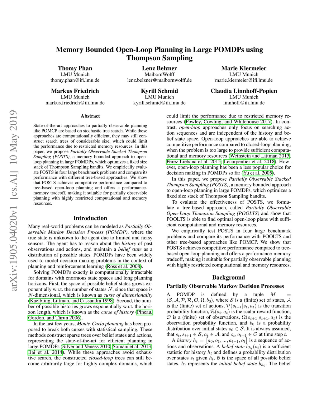 Memory Bounded Open-Loop Planning in Large POMDPs using Thompson