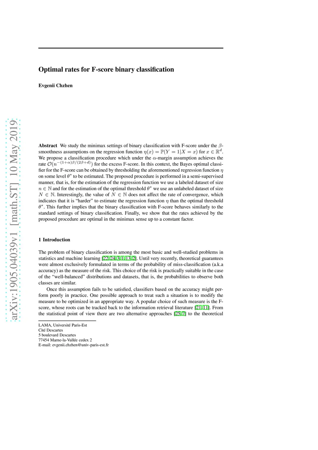 We study the minimax settings of binary classification with F-score under the -smoothness assumptions on the regression function for . We propose a classification procedure which under the -margin assumption achieves the rate for the excess F-score. In this context, the Bayes optimal classifier for the F-score can be obtained by thresholding the aforementioned regression function on some level to be estimated. The proposed procedure is performed in a semi-supervised manner, that is, for the estimation of the regression function we use a labeled dataset of size and for the estimation of the optimal threshold we use an unlabeled dataset of size . Interestingly, the value of does not affect the rate of convergence, which indicates that it is "harder" to estimate the regression function than the optimal threshold . This further implies that the binary classification with F-score behaves similarly to the standard settings of binary classification. Finally, we show that the rates achieved by the proposed procedure are optimal in the minimax sense up to a constant factor.