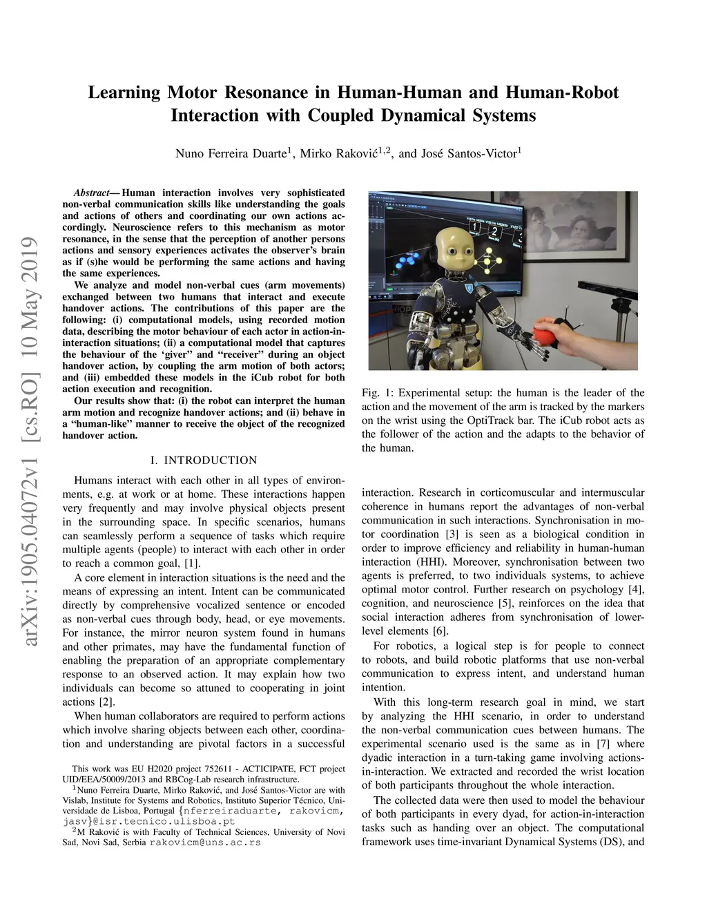 Human interaction involves very sophisticated non-verbal communication skills like understanding the goals and actions of others and coordinating our own actions accordingly. Neuroscience refers to this mechanism as motor resonance, in the sense that the perception of another person's actions and sensory experiences activates the observer's brain as if (s)he would be performing the same actions and having the same experiences. We analyze and model non-verbal cues (arm movements) exchanged between two humans that interact and execute handover actions. The contributions of this paper are the following: (i) computational models, using recorded motion data, describing the motor behaviour of each actor in action-in-interaction situations, (ii) a computational model that captures the behaviour if the "giver" and "receiver" during an object handover action, by coupling the arm motion of both actors, and (iii) embedded these models in the iCub robot for both action execution and recognition. Our results show that: (i) the robot can interpret the human arm motion and recognize handover actions; and (ii) behave in a "human-like" manner to receive the object of the recognized handover action.