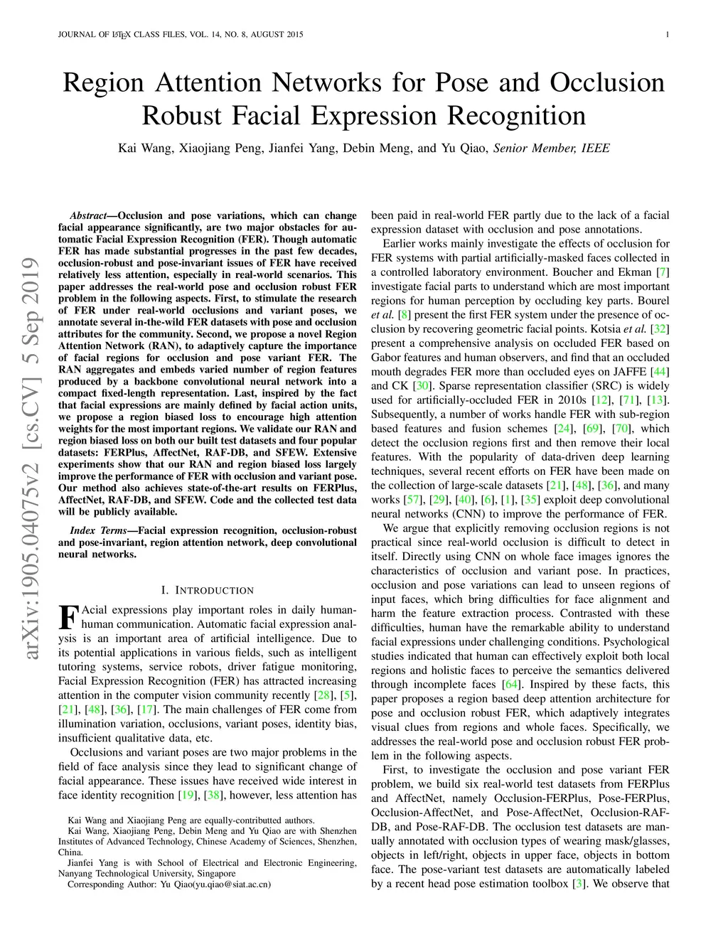 Occlusion and pose variations, which can change facial appearance significantly, are two major obstacles for automatic Facial Expression Recognition (FER). Though automatic FER has made substantial progresses in the past few decades, occlusion-robust and pose-invariant issues of FER have received relatively less attention, especially in real-world scenarios. This paper addresses the real-world pose and occlusion robust FER problem with three-fold contributions. First, to stimulate the research of FER under real-world occlusions and variant poses, we build several in-the-wild facial expression datasets with manual annotations for the community. Second, we propose a novel Region Attention Network (RAN), to adaptively capture the importance of facial regions for occlusion and pose variant FER. The RAN aggregates and embeds varied number of region features produced by a backbone convolutional neural network into a compact fixed-length representation. Last, inspired by the fact that facial expressions are mainly defined by facial action units, we propose a region biased loss to encourage high attention weights for the most important regions. We validate our RAN and region biased loss on both our built test datasets and four popular datasets: FERPlus, AffectNet, RAF-DB, and SFEW. Extensive experiments show that our RAN and region biased loss largely improve the performance of FER with occlusion and variant pose. Our method also achieves state-of-the-art results on FERPlus, AffectNet, RAF-DB, and SFEW. Code and the collected test data will be publicly available.