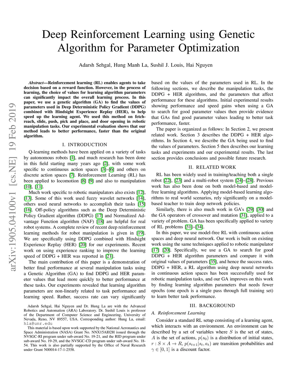 Reinforcement learning (RL) enables agents to take decision based on a reward function. However, in the process of learning, the choice of values for learning algorithm parameters can significantly impact the overall learning process. In this paper, we use a genetic algorithm (GA) to find the values of parameters used in Deep Deterministic Policy Gradient (DDPG) combined with Hindsight Experience Replay (HER), to help speed up the learning agent. We used this method on fetch-reach, slide, push, pick and place, and door opening in robotic manipulation tasks. Our experimental evaluation shows that our method leads to better performance, faster than the original algorithm.