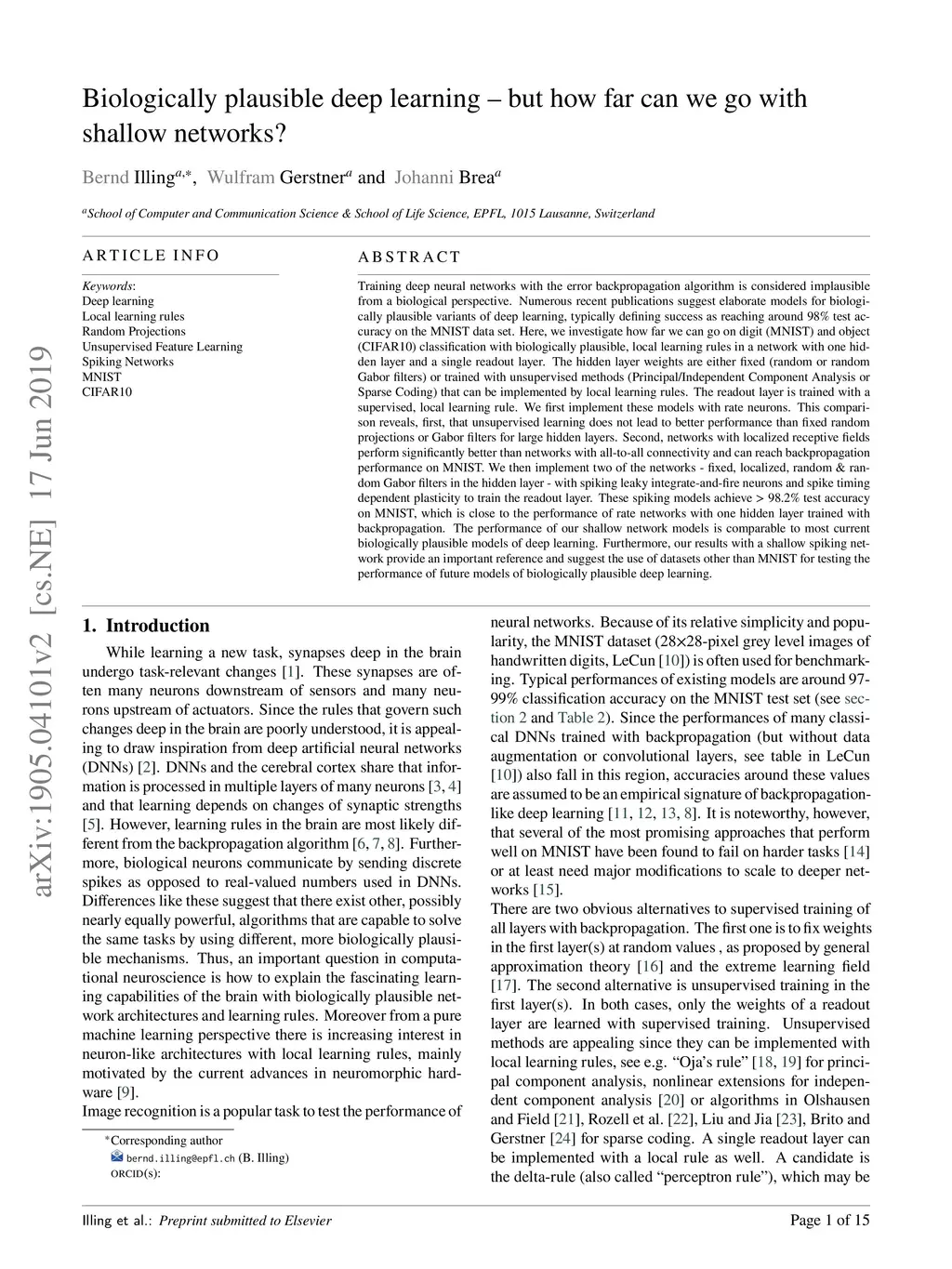 Training deep neural networks with the error backpropagation algorithm is considered implausible from a biological perspective. Numerous recent publications suggest elaborate models for biologically plausible variants of deep learning, typically defining success as reaching around 98% test accuracy on the MNIST data set. Here, we investigate how far we can go on digit (MNIST) and object (CIFAR10) classification with biologically plausible, local learning rules in a network with one hidden layer and a single readout layer. The hidden layer weights are either fixed (random or random Gabor filters) or trained with unsupervised methods (PCA, ICA or Sparse Coding) that can be implemented by local learning rules. The readout layer is trained with a supervised, local learning rule. We first implement these models with rate neurons. This comparison reveals, first, that unsupervised learning does not lead to better performance than fixed random projections or Gabor filters for large hidden layers. Second, networks with localized receptive fields perform significantly better than networks with all-to-all connectivity and can reach backpropagation performance on MNIST. We then implement two of the networks - fixed, localized, random & random Gabor filters in the hidden layer - with spiking leaky integrate-and-fire neurons and spike timing dependent plasticity to train the readout layer. These spiking models achieve > 98.2% test accuracy on MNIST, which is close to the performance of rate networks with one hidden layer trained with backpropagation. The performance of our shallow network models is comparable to most current biologically plausible models of deep learning. Furthermore, our results with a shallow spiking network provide an important reference and suggest the use of datasets other than MNIST for testing the performance of future models of biologically plausible deep learning.