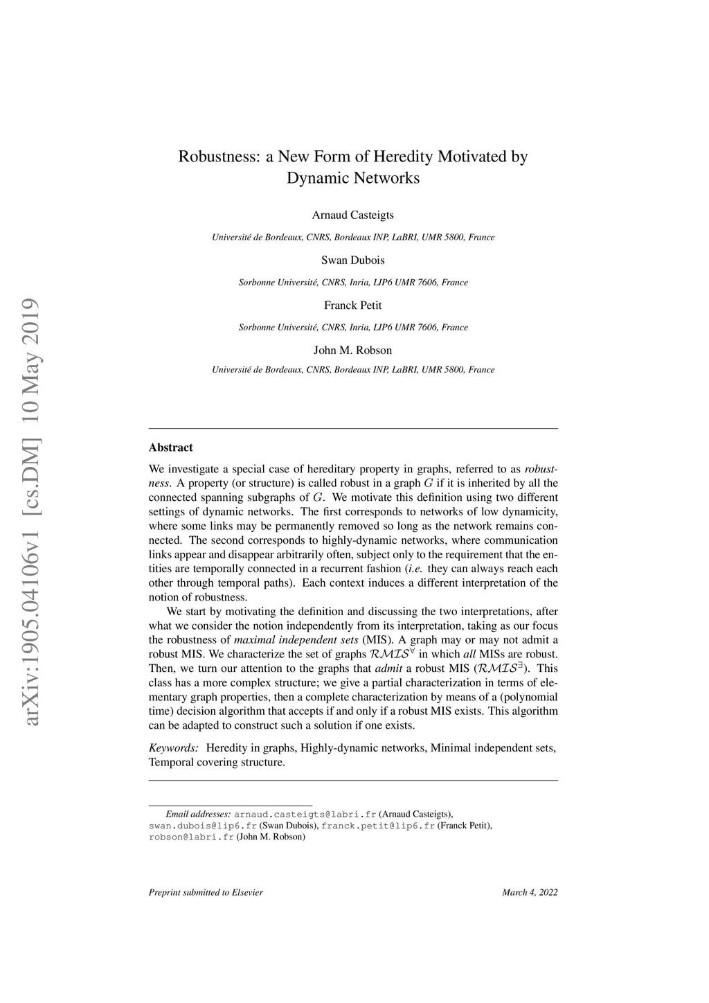 We investigate a special case of hereditary property in graphs, referred to as {\em robustness}. A property (or structure) is called robust in a graph if it is inherited by all the connected spanning subgraphs of . We motivate this definition using two different settings of dynamic networks. The first corresponds to networks of low dynamicity, where some links may be permanently removed so long as the network remains connected. The second corresponds to highly-dynamic networks, where communication links appear and disappear arbitrarily often, subject only to the requirement that the entities are temporally connected in a recurrent fashion ({\it i.e.} they can always reach each other through temporal paths). Each context induces a different interpretation of the notion of robustness. We start by motivating the definition and discussing the two interpretations, after what we consider the notion independently from its interpretation, taking as our focus the robustness of {\em maximal independent sets} (MIS). A graph may or may not admit a robust MIS. We characterize the set of graphs \forallMIS in which {\em all} MISs are robust. Then, we turn our attention to the graphs that {\em admit} a robust MIS (\existsMIS). This class has a more complex structure; we give a partial characterization in terms of elementary graph properties, then a complete characterization by means of a (polynomial time) decision algorithm that accepts if and only if a robust MIS exists. This algorithm can be adapted to construct such a solution if one exists.
