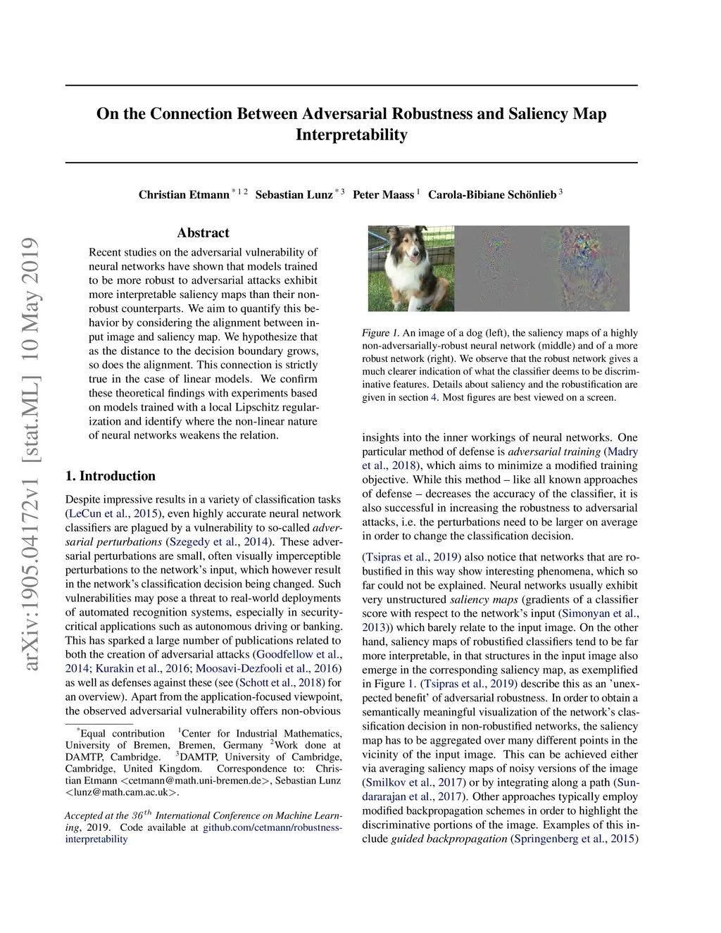 Recent studies on the adversarial vulnerability of neural networks have shown that models trained to be more robust to adversarial attacks exhibit more interpretable saliency maps than their non-robust counterparts. We aim to quantify this behavior by considering the alignment between input image and saliency map. We hypothesize that as the distance to the decision boundary grows,so does the alignment. This connection is strictly true in the case of linear models. We confirm these theoretical findings with experiments based on models trained with a local Lipschitz regularization and identify where the non-linear nature of neural networks weakens the relation.