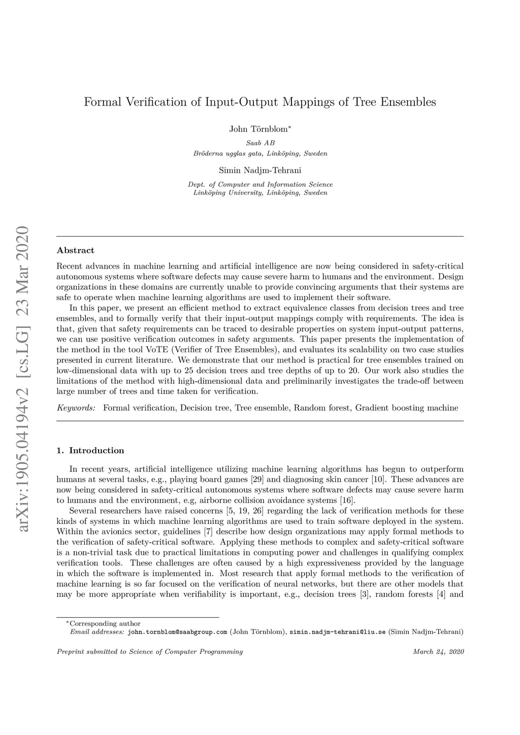 Recent advances in machine learning and artificial intelligence are now being considered in safety-critical autonomous systems where software defects may cause severe harm to humans and the environment. Design organizations in these domains are currently unable to provide convincing arguments that their systems are safe to operate when machine learning algorithms are used to implement their software. In this paper, we present an efficient method to extract equivalence classes from decision trees and tree ensembles, and to formally verify that their input-output mappings comply with requirements. The idea is that, given that safety requirements can be traced to desirable properties on system input-output patterns, we can use positive verification outcomes in safety arguments. This paper presents the implementation of the method in the tool VoTE (Verifier of Tree Ensembles), and evaluates its scalability on two case studies presented in current literature. We demonstrate that our method is practical for tree ensembles trained on low-dimensional data with up to 25 decision trees and tree depths of up to 20. Our work also studies the limitations of the method with high-dimensional data and preliminarily investigates the trade-off between large number of trees and time taken for verification.