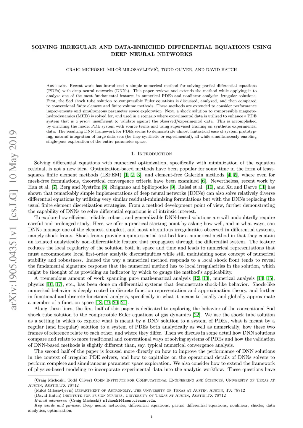 Recent work has introduced a simple numerical method for solving partial differential equations (PDEs) with deep neural networks (DNNs). This paper reviews and extends the method while applying it to analyze one of the most fundamental features in numerical PDEs and nonlinear analysis: irregular solutions. First, the Sod shock tube solution to compressible Euler equations is discussed, analyzed, and then compared to conventional finite element and finite volume methods. These methods are extended to consider performance improvements and simultaneous parameter space exploration. Next, a shock solution to compressible magnetohydrodynamics (MHD) is solved for, and used in a scenario where experimental data is utilized to enhance a PDE system that is \emph{a priori} insufficient to validate against the observed/experimental data. This is accomplished by enriching the model PDE system with source terms and using supervised training on synthetic experimental data. The resulting DNN framework for PDEs seems to demonstrate almost fantastical ease of system prototyping, natural integration of large data sets (be they synthetic or experimental), all while simultaneously enabling single-pass exploration of the entire parameter space.