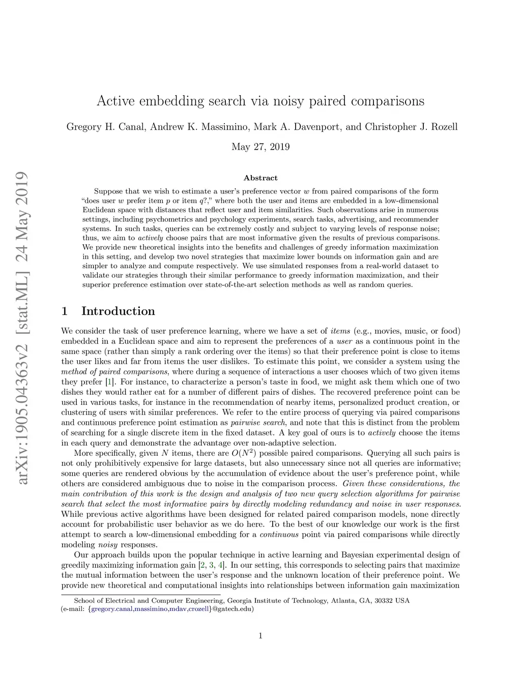 Suppose that we wish to estimate a user's preference vector from paired comparisons of the form "does user prefer item or item ?," where both the user and items are embedded in a low-dimensional Euclidean space with distances that reflect user and item similarities. Such observations arise in numerous settings, including psychometrics and psychology experiments, search tasks, advertising, and recommender systems. In such tasks, queries can be extremely costly and subject to varying levels of response noise; thus, we aim to actively choose pairs that are most informative given the results of previous comparisons. We provide new theoretical insights into the benefits and challenges of greedy information maximization in this setting, and develop two novel strategies that maximize lower bounds on information gain and are simpler to analyze and compute respectively. We use simulated responses from a real-world dataset to validate our strategies through their similar performance to greedy information maximization, and their superior preference estimation over state-of-the-art selection methods as well as random queries.
