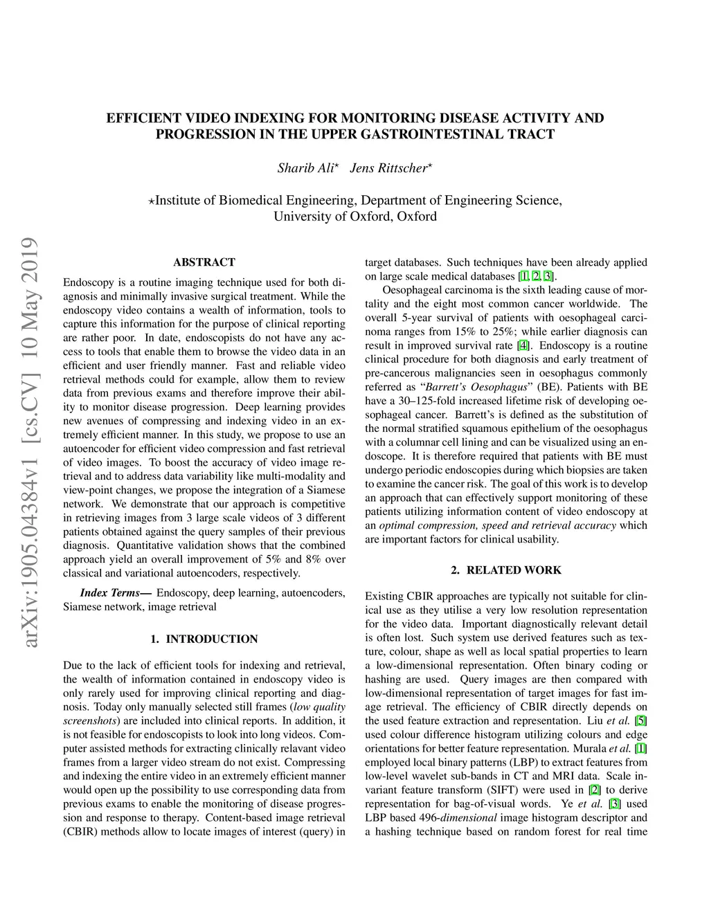 Endoscopy is a routine imaging technique used for both diagnosis and minimally invasive surgical treatment. While the endoscopy video contains a wealth of information, tools to capture this information for the purpose of clinical reporting are rather poor. In date, endoscopists do not have any access to tools that enable them to browse the video data in an efficient and user friendly manner. Fast and reliable video retrieval methods could for example, allow them to review data from previous exams and therefore improve their ability to monitor disease progression. Deep learning provides new avenues of compressing and indexing video in an extremely efficient manner. In this study, we propose to use an autoencoder for efficient video compression and fast retrieval of video images. To boost the accuracy of video image retrieval and to address data variability like multi-modality and view-point changes, we propose the integration of a Siamese network. We demonstrate that our approach is competitive in retrieving images from 3 large scale videos of 3 different patients obtained against the query samples of their previous diagnosis. Quantitative validation shows that the combined approach yield an overall improvement of 5% and 8% over classical and variational autoencoders, respectively.