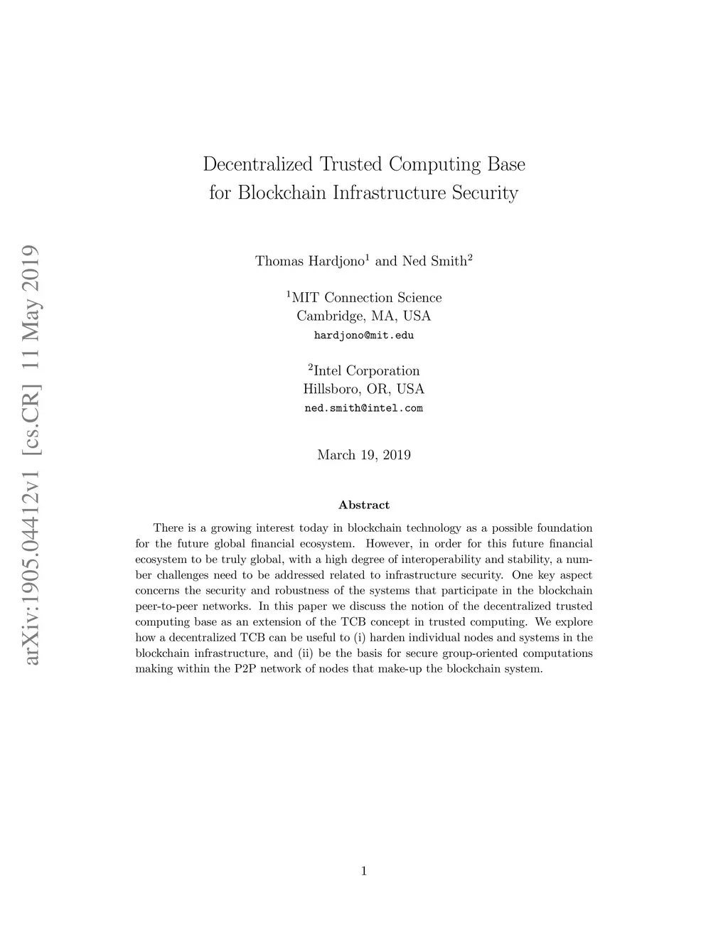 There is a growing interest today in blockchain technology as a possible foundation for the future global financial ecosystem. However, in order for this future financial ecosystem to be truly global, with a high degree of interoperability and stability, a number challenges need to be addressed related to infrastructure security. One key aspect concerns the security and robustness of the systems that participate in the blockchain peer-to-peer networks. In this paper we discuss the notion of the decentralized trusted computing base as an extension of the TCB concept in trusted computing. We explore how a decentralized TCB can be useful to (i) harden individual nodes and systems in the blockchain infrastructure, and (ii) be the basis for secure group-oriented computations making within the P2P network of nodes that make-up the blockchain system.