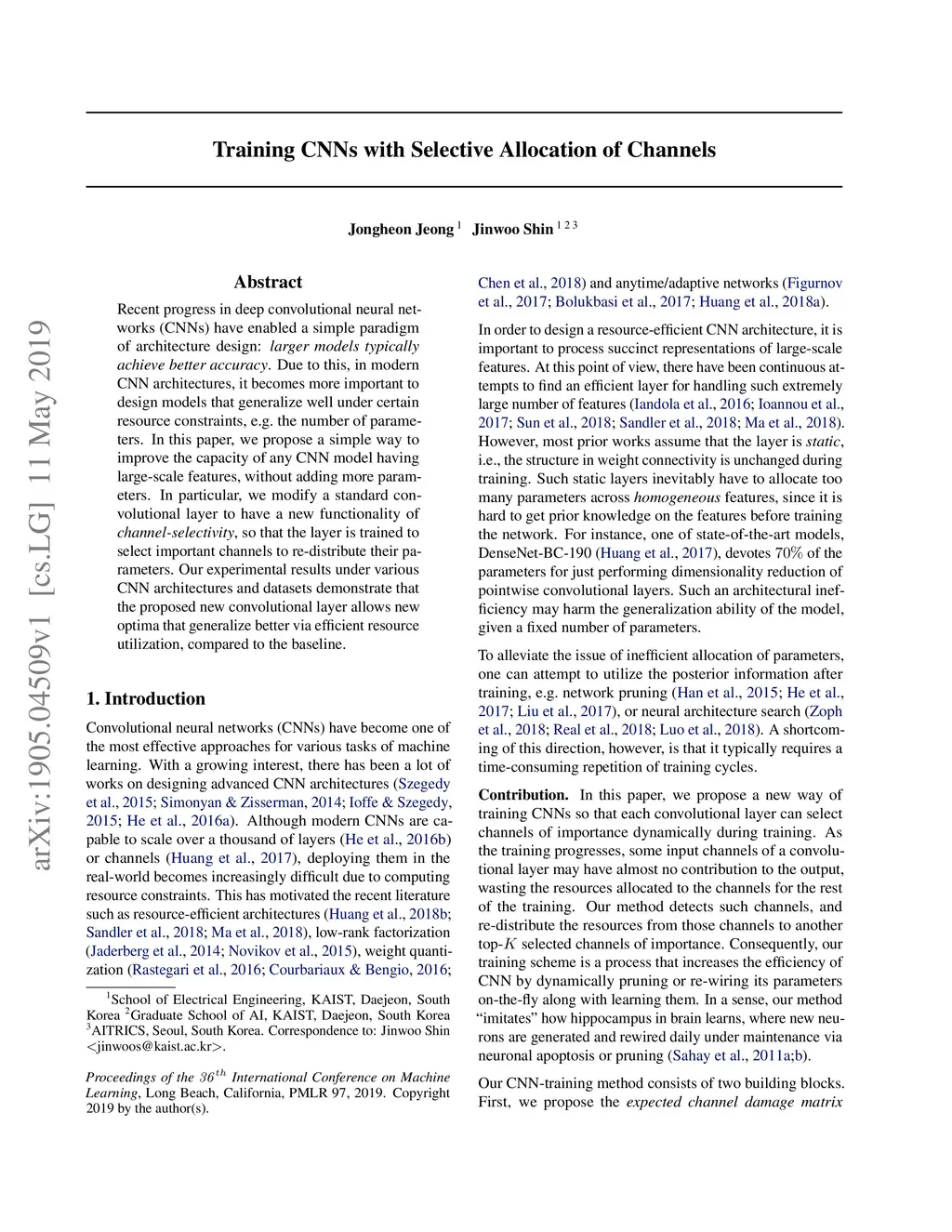 Recent progress in deep convolutional neural networks (CNNs) have enabled a simple paradigm of architecture design: larger models typically achieve better accuracy. Due to this, in modern CNN architectures, it becomes more important to design models that generalize well under certain resource constraints, e.g. the number of parameters. In this paper, we propose a simple way to improve the capacity of any CNN model having large-scale features, without adding more parameters. In particular, we modify a standard convolutional layer to have a new functionality of channel-selectivity, so that the layer is trained to select important channels to re-distribute their parameters. Our experimental results under various CNN architectures and datasets demonstrate that the proposed new convolutional layer allows new optima that generalize better via efficient resource utilization, compared to the baseline.